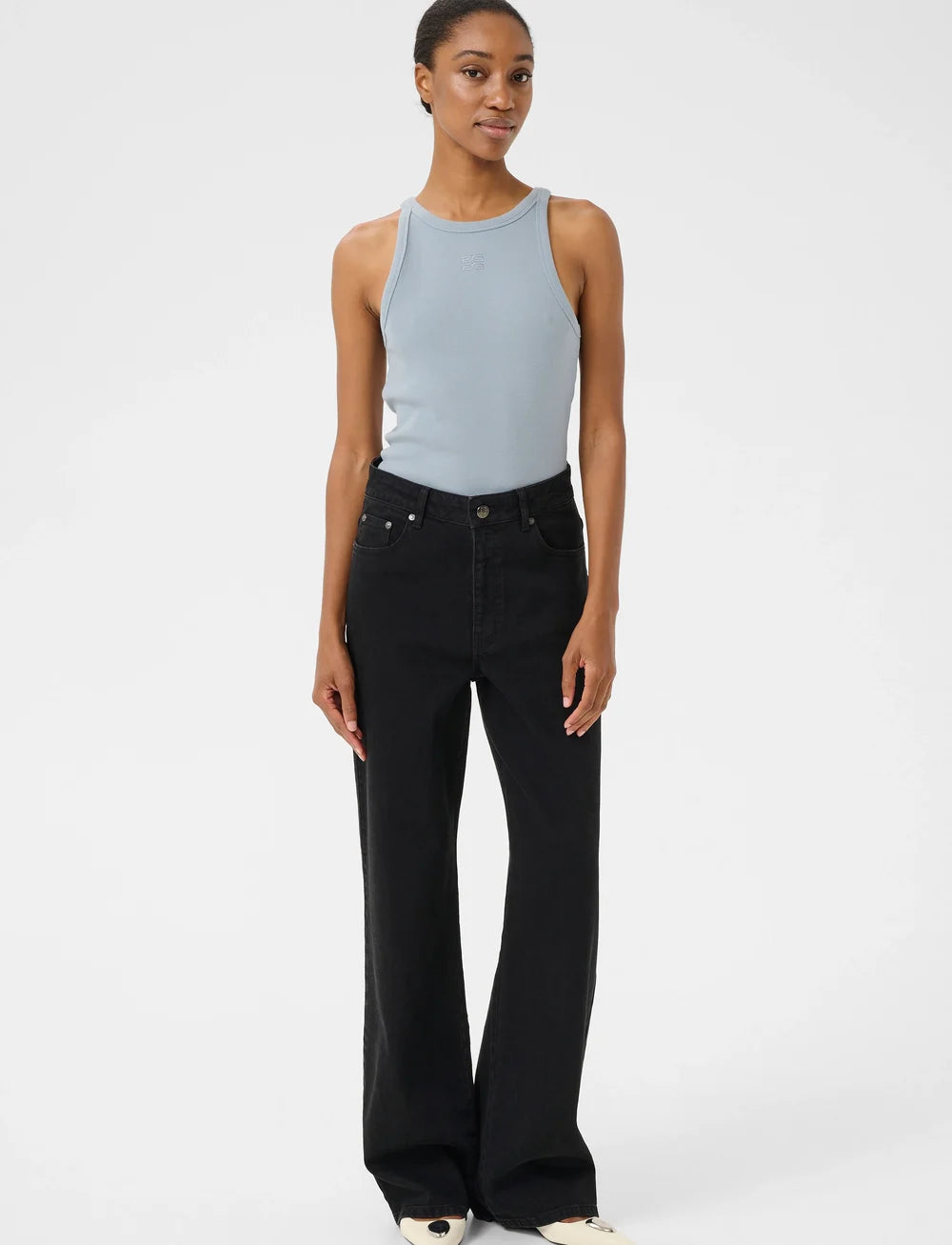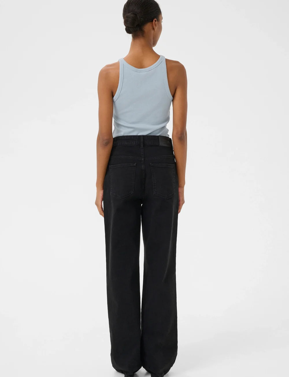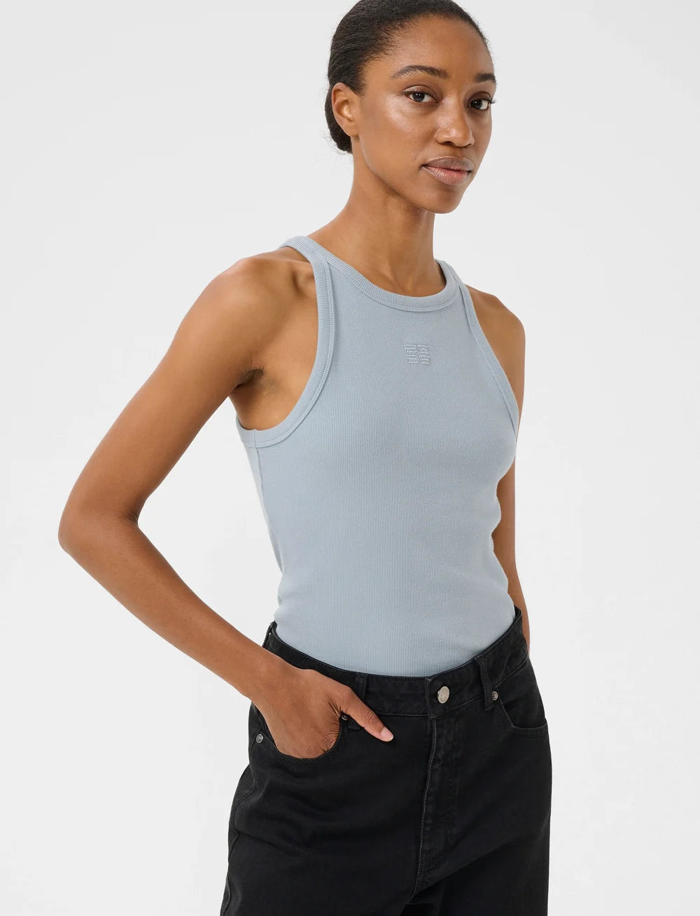 Débardeur signature à col rond côtelé. Finition bord-côte extérieur et double encolure dégagée.