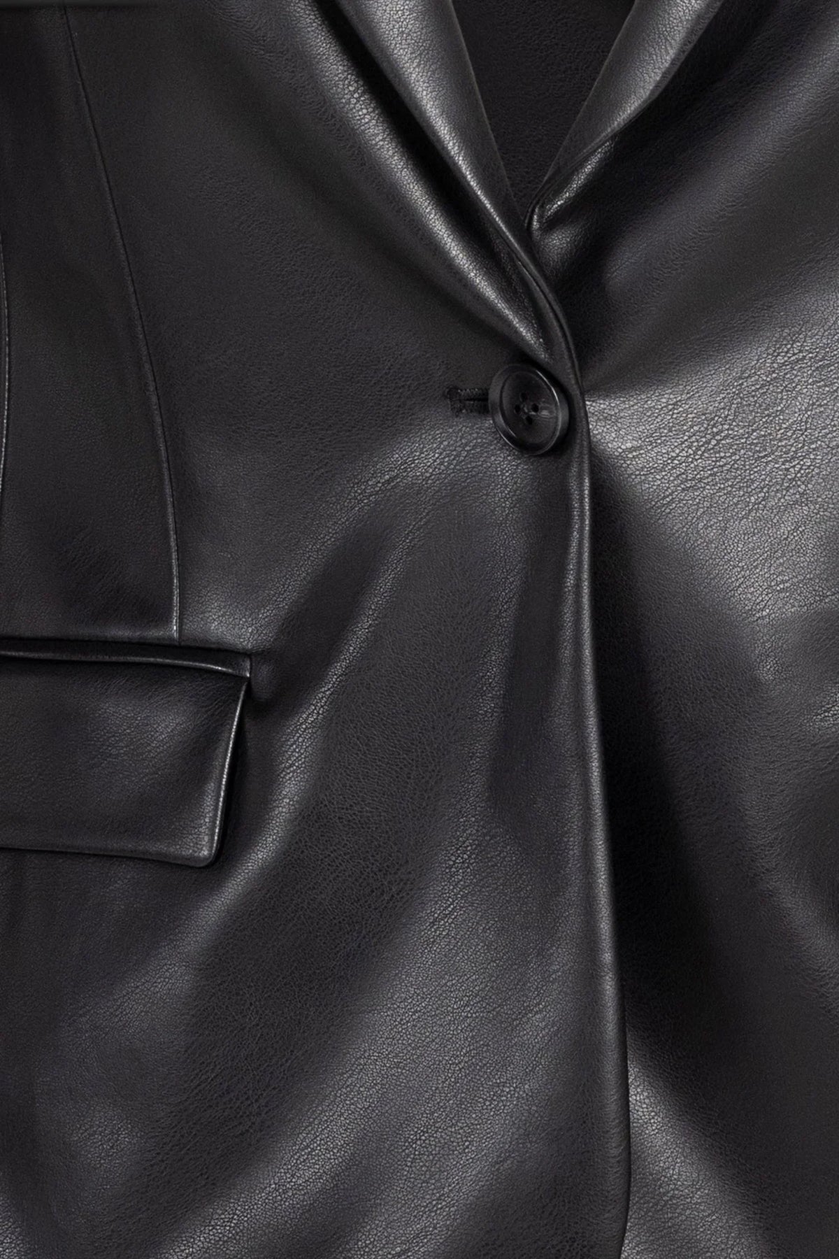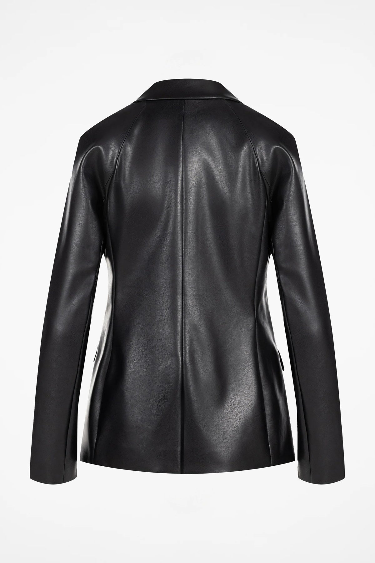 Construction à manches raglan pour une forme raffinée ; Intérieur entièrement doublé pour plus de confort et de structure ; Fermeture avant à un bouton pour une finition soignée ; Silhouette ajustée pour une coupe flatteuse ; Finition en similicuir lisse pour un poli moderne.