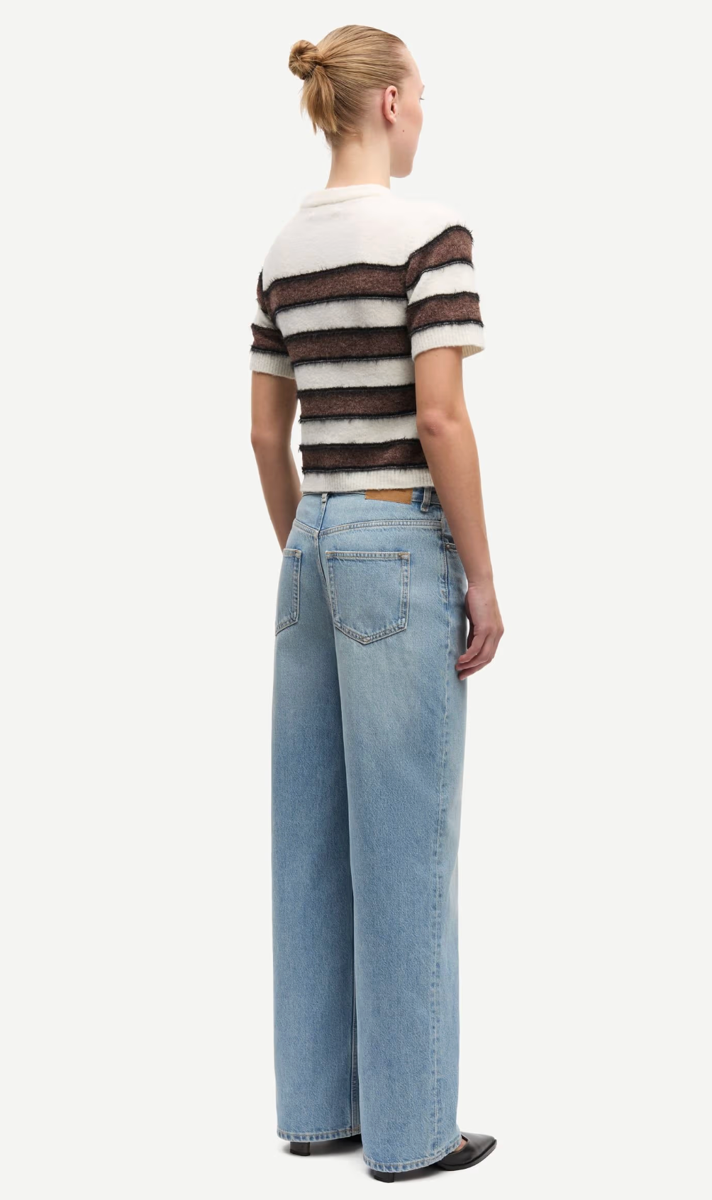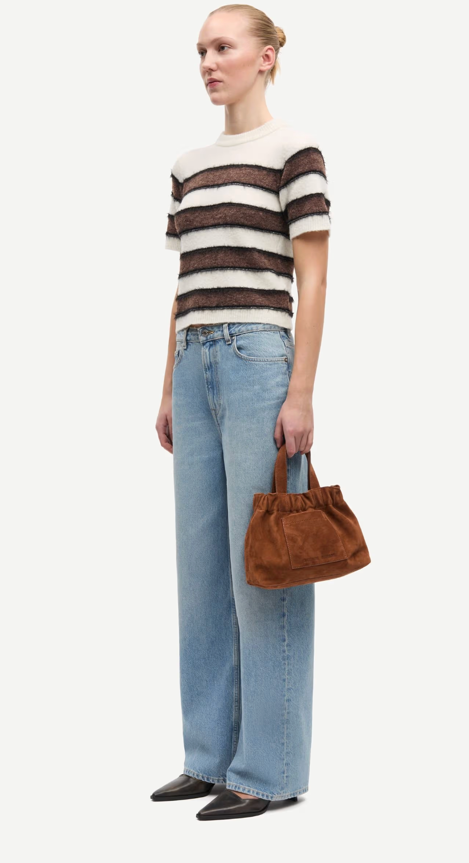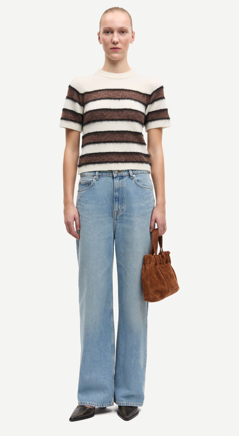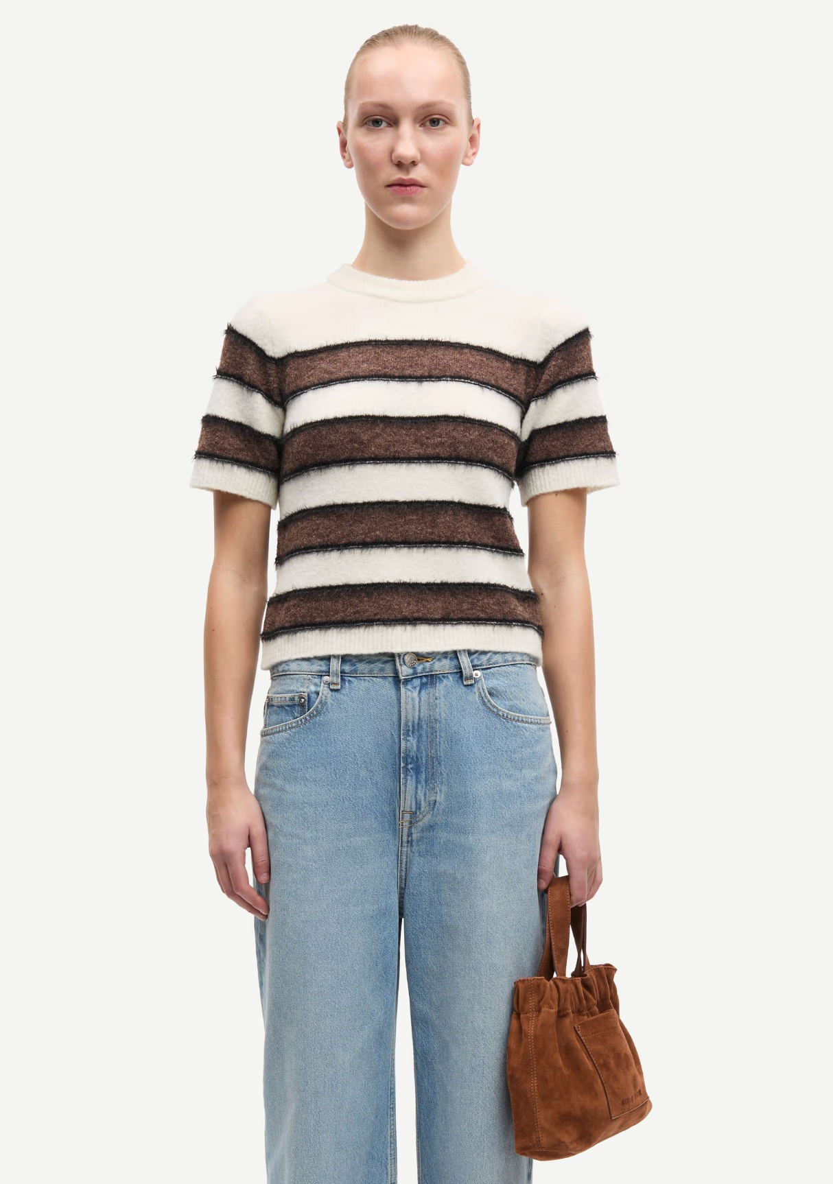 Haut tricoté à rayures avec une coupe régulière. Col, poignets et ourlet côtelés. Encolure ronde. Finition brossée pour une texture douce. Matière principale composée d’un mélange incluant de la laine d’alpaga et de la laine mérinos.