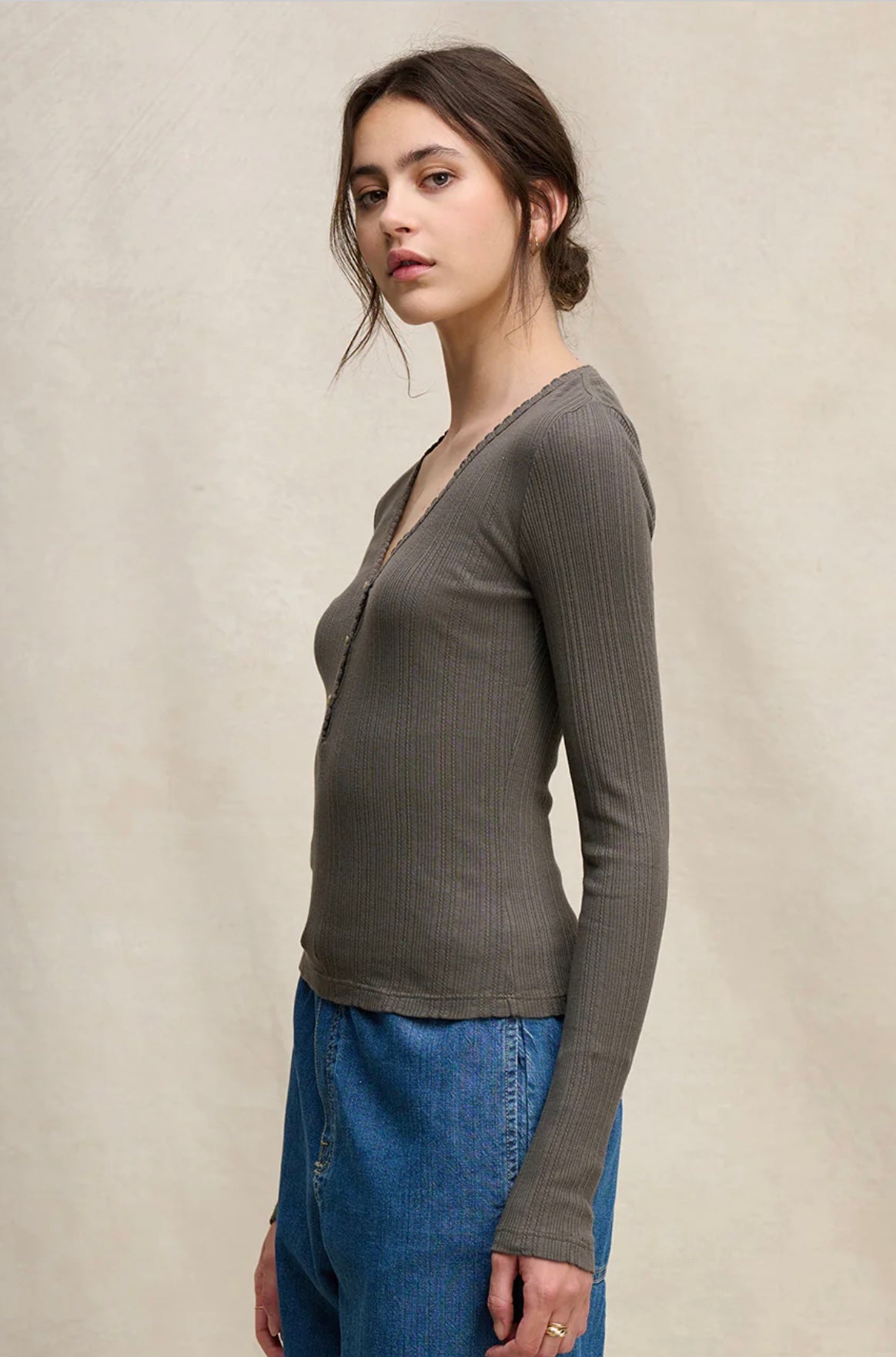 Délicat et féminin, ce haut à manches longues et col en V en pointelle est la pièce idéale à superposer pour les journées plus fraîches. Confectionné en maille douce et respirante, il présente des coutures pointelle complexes qui lui confèrent texture et charme subtil. Son décolleté en V flatteur et sa coupe ajustée en font un vêtement idéal à glisser dans un jean ou à associer à une tenue décontractée.