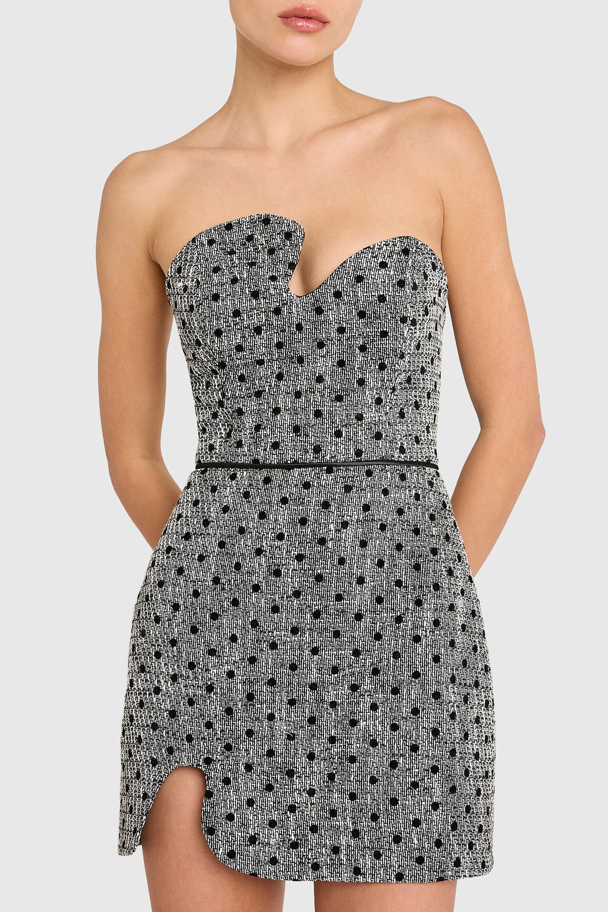 Faites bouger les choses avec la mini-robe bustier Puzzle. Cette mini-robe sculpturale est confectionnée en tweed à pois et présente des découpes uniques en forme de puzzle le long de l'encolure et de l'ourlet. Associez-la à une veste en cuir et soyez remarquée.