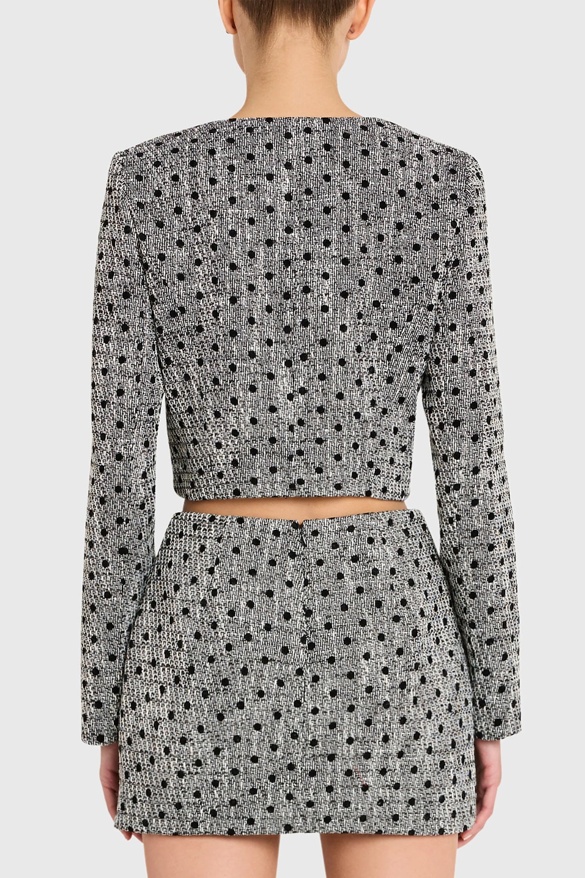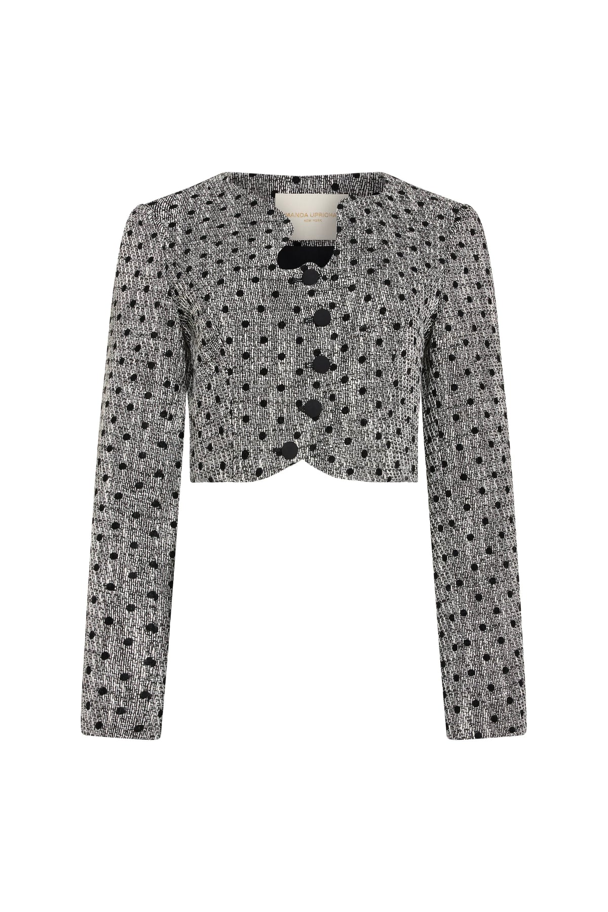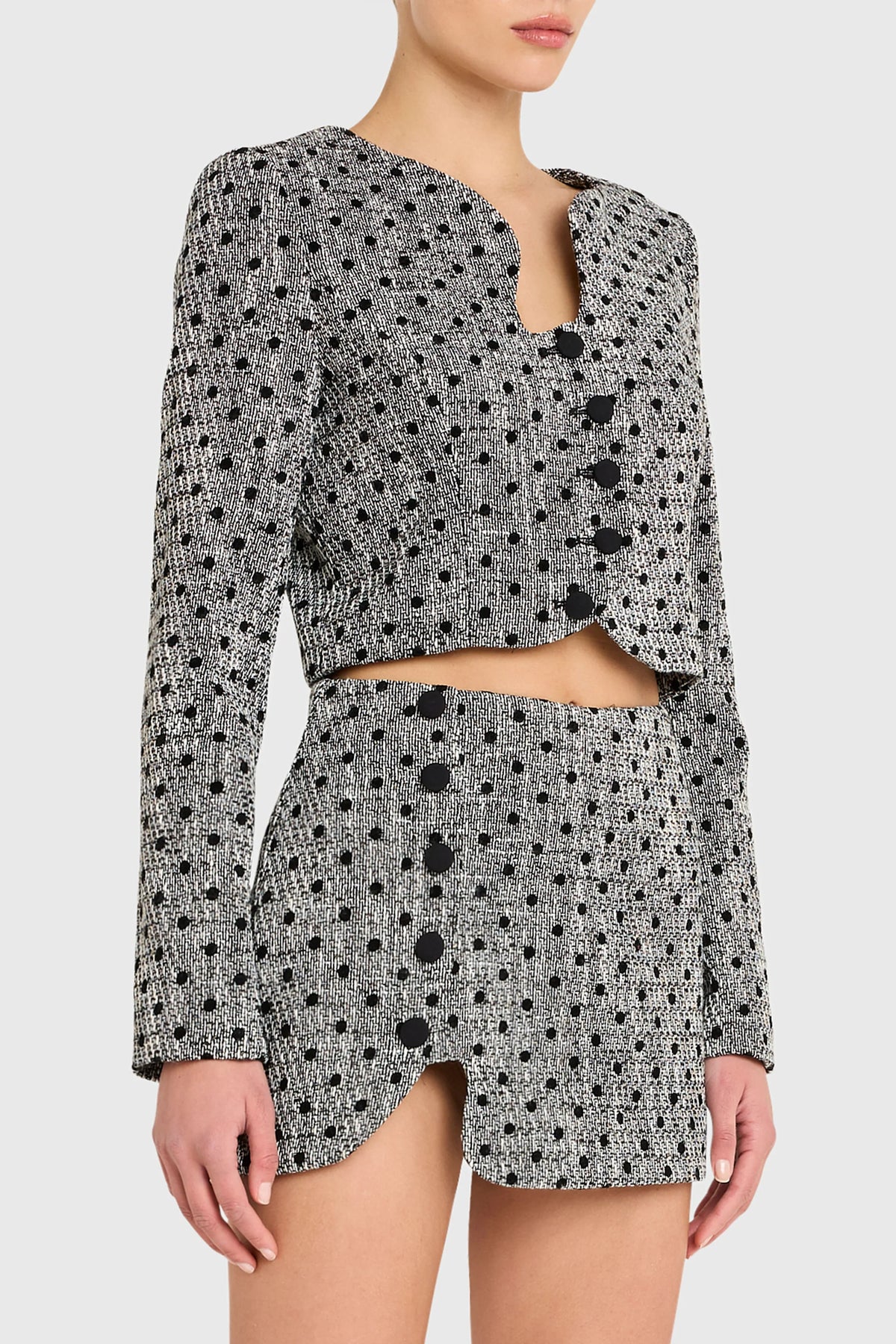Changez de look avec la veste Puzzle. Confectionnée en tweed à pois, cette veste présente une découpe unique à l'encolure et une fermeture boutonnée incurvée. Associez-la à la jupe-short Puzzle assortie ou optez pour une tenue plus décontractée avec votre jean taille haute préféré.