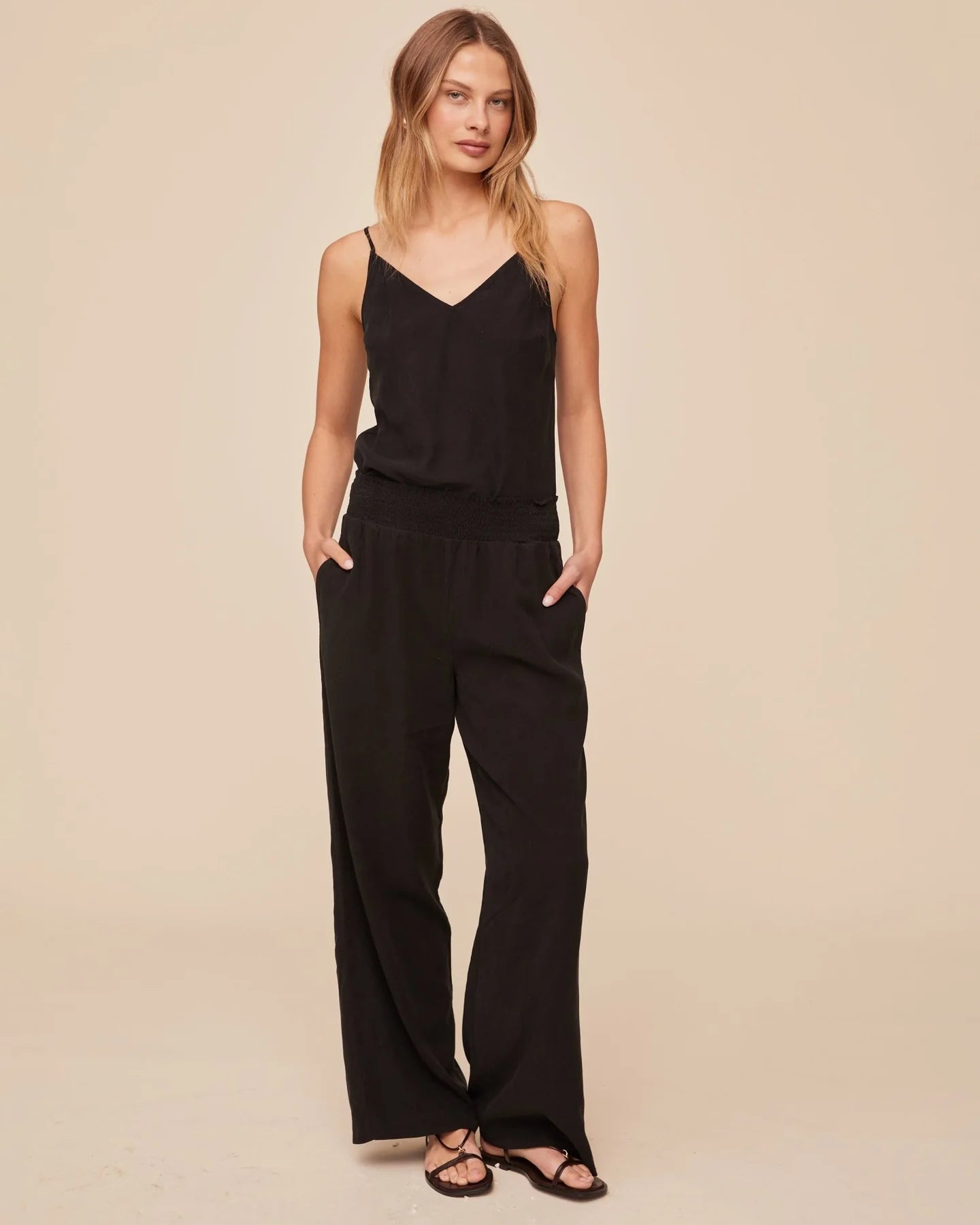 Pantalon à jambe large avec taille smockée, conçu pour un confort absolu et une grande liberté de mouvement. Un essentiel facile à porter pour la saison chaude.