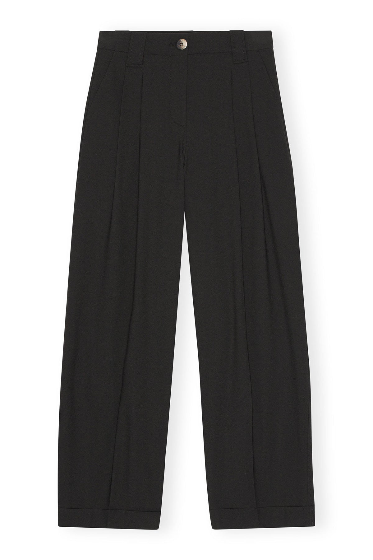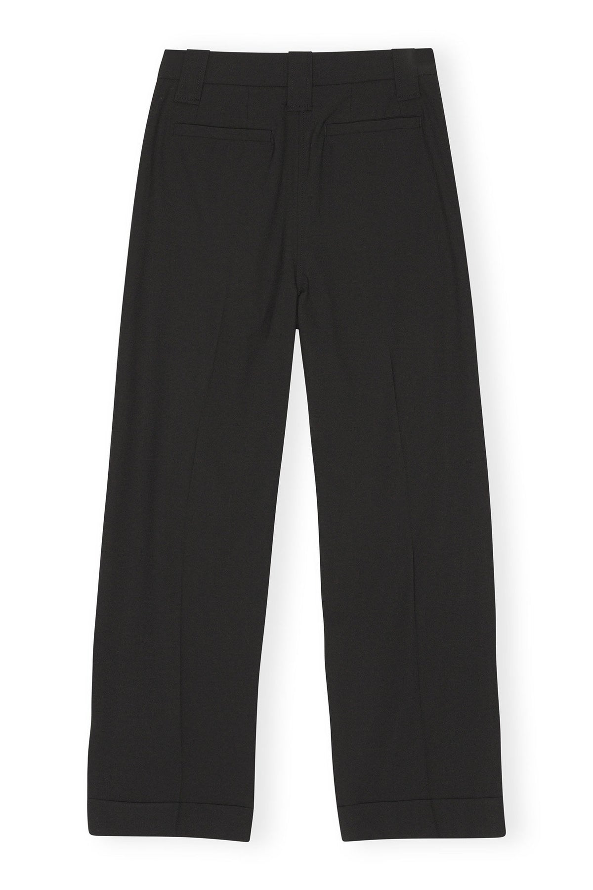 Ces pantalons noirs en mélange drapé avec plis présentent une fermeture à zip et à bouton, des passants de ceinture, ainsi que des poches à l'arrière et sur les côtés.