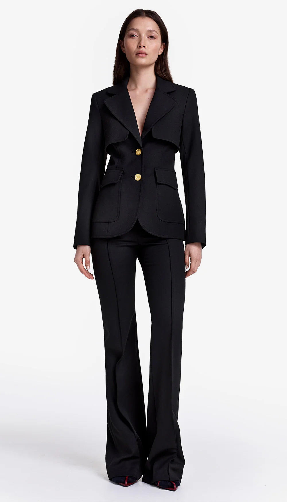 Notes de style : Ce tissu est intemporel et facile à emporter en voyage. Portez-le avec le blazer assorti pour un costume noir moderne.