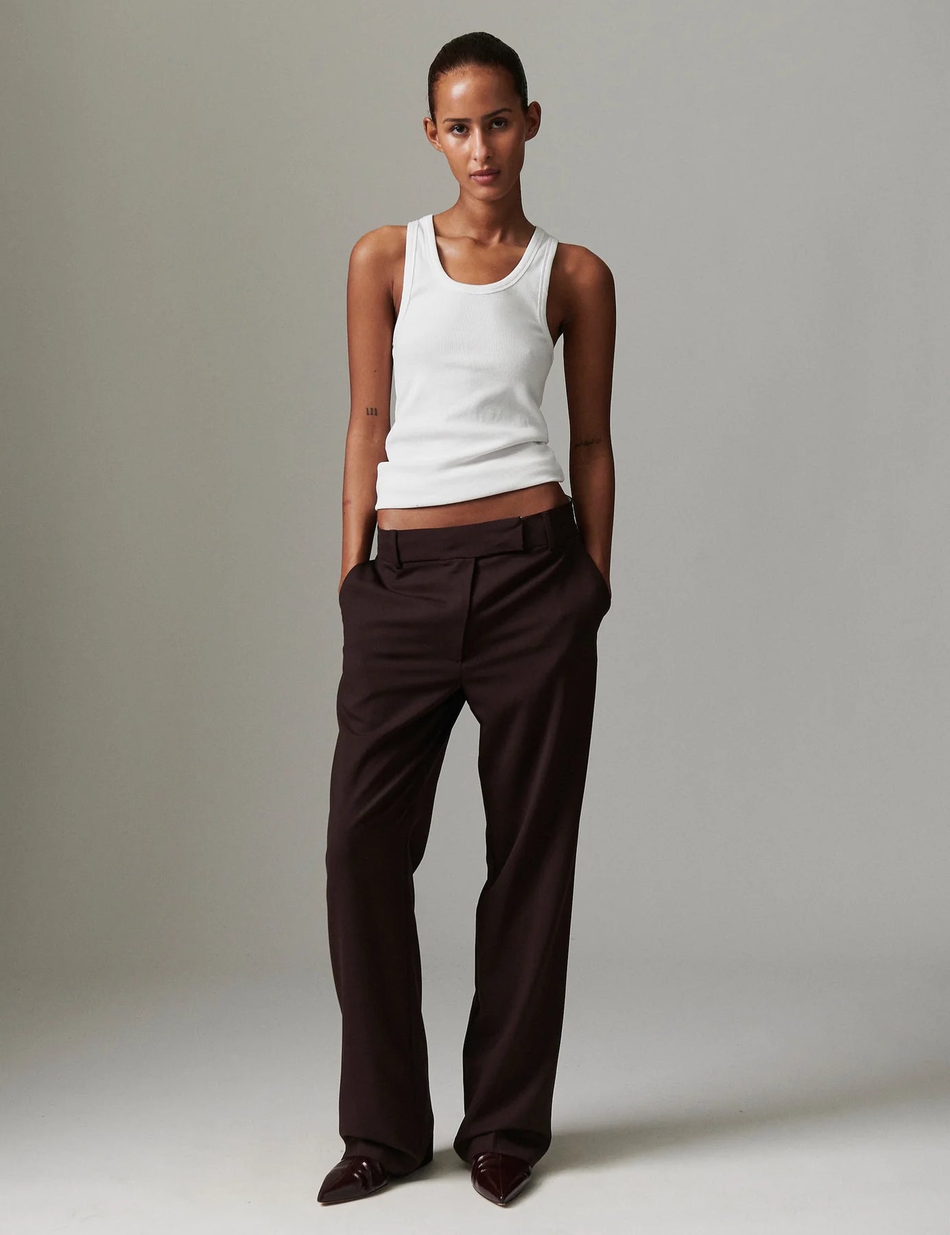 Ce pantalon droit taille mi-haute est doté d'une braguette zippée avec fermeture à crochet et s'élargit légèrement à l'ourlet. Il présente une coupe classique.