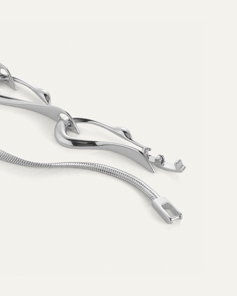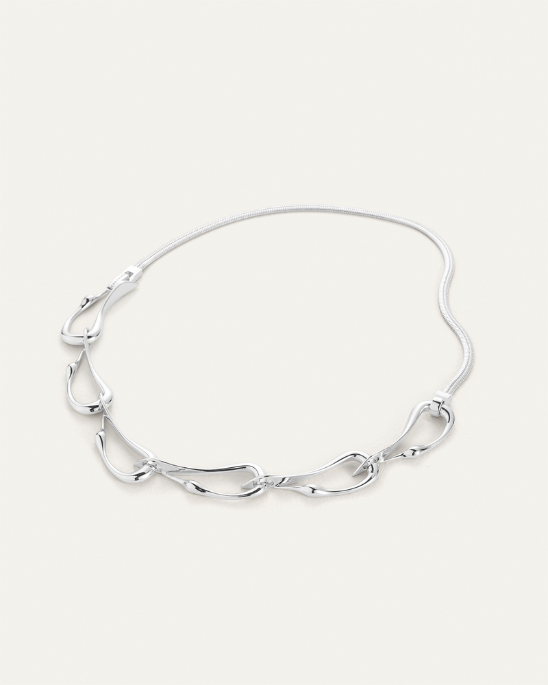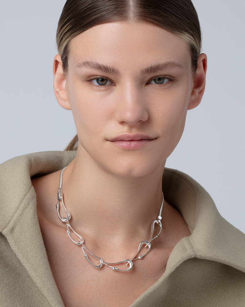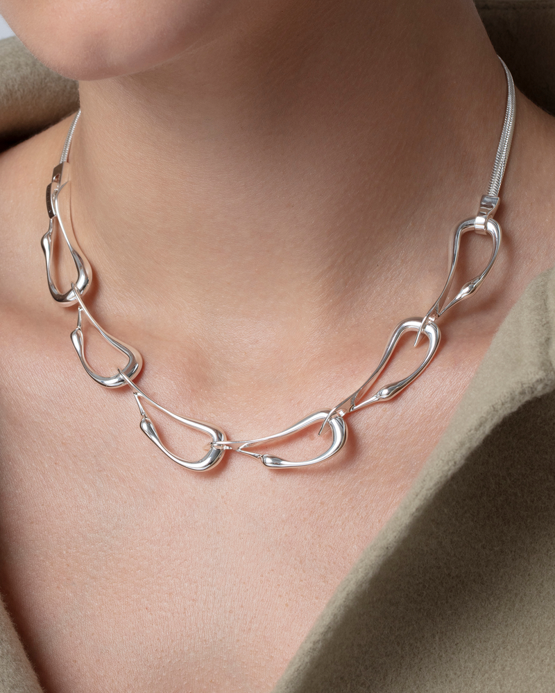 Collier ras-du-cou en argent orné de six aigrettes superposées. Ce bijou bouge avec vous et repose à plat sur le cou. Finition en argent poli.