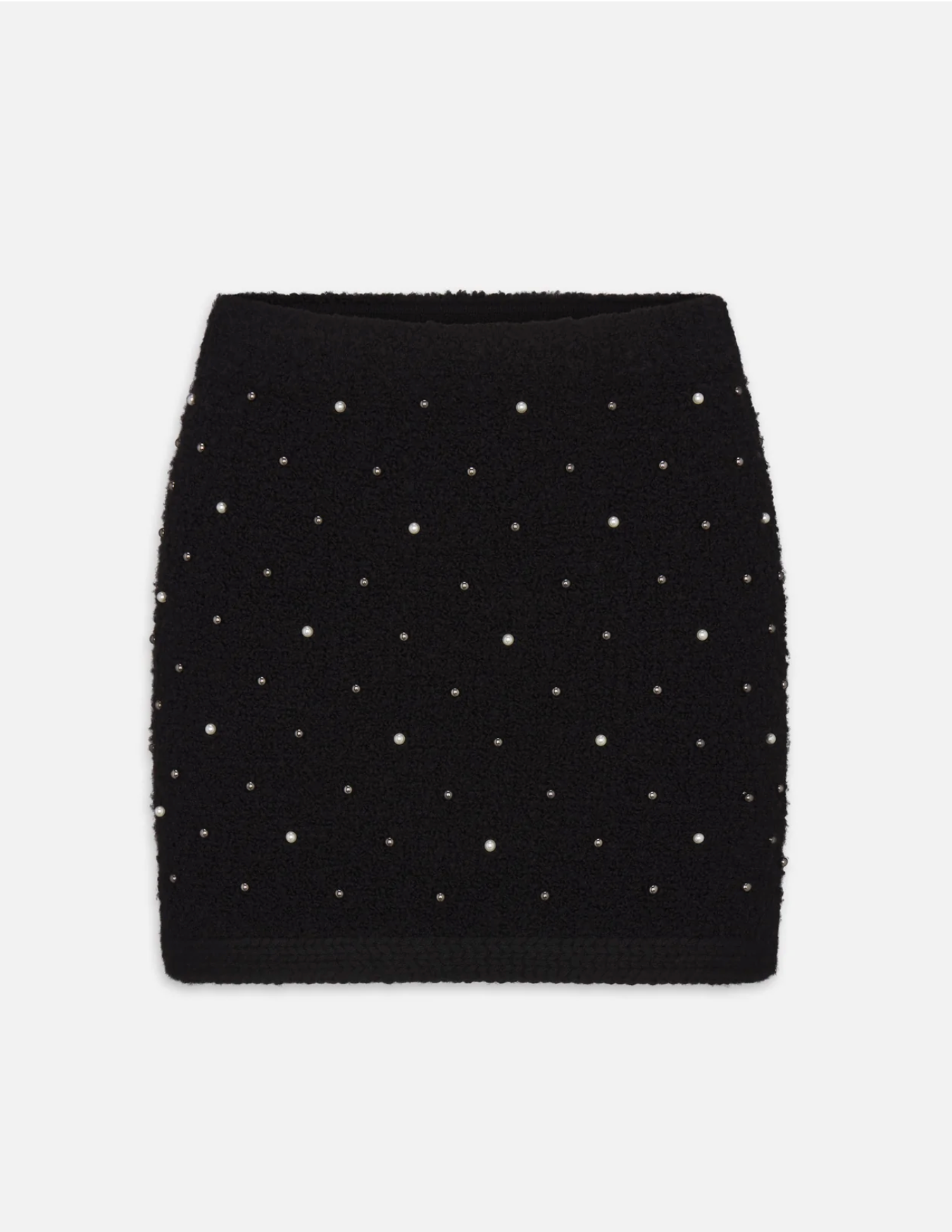 Version moderne de la mini-jupe noire classique, cette jupe en maille douce est ornée de perles et de strass sur toute la surface. Elle s’enfile facilement sans fermeture. À porter avec The Embellished Jacket pour un look complet et sophistiqué.