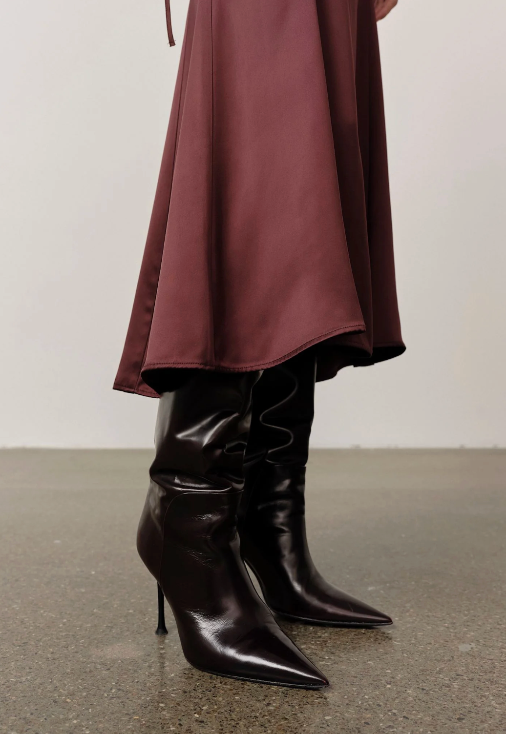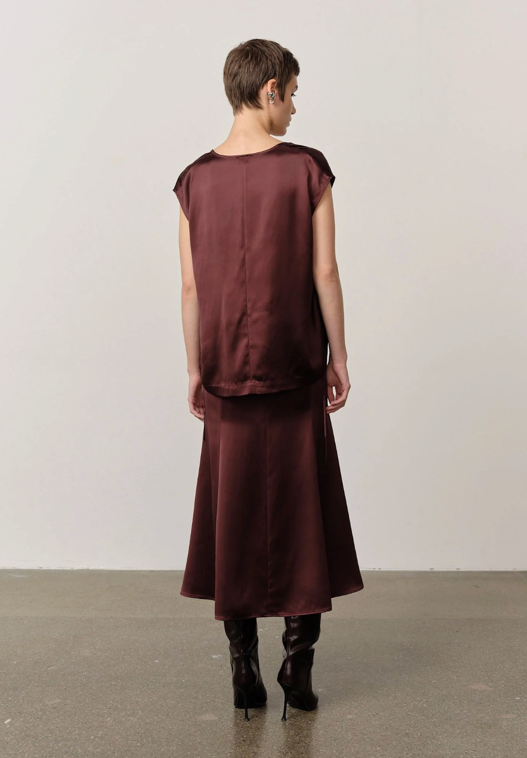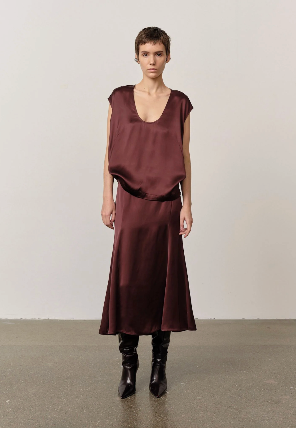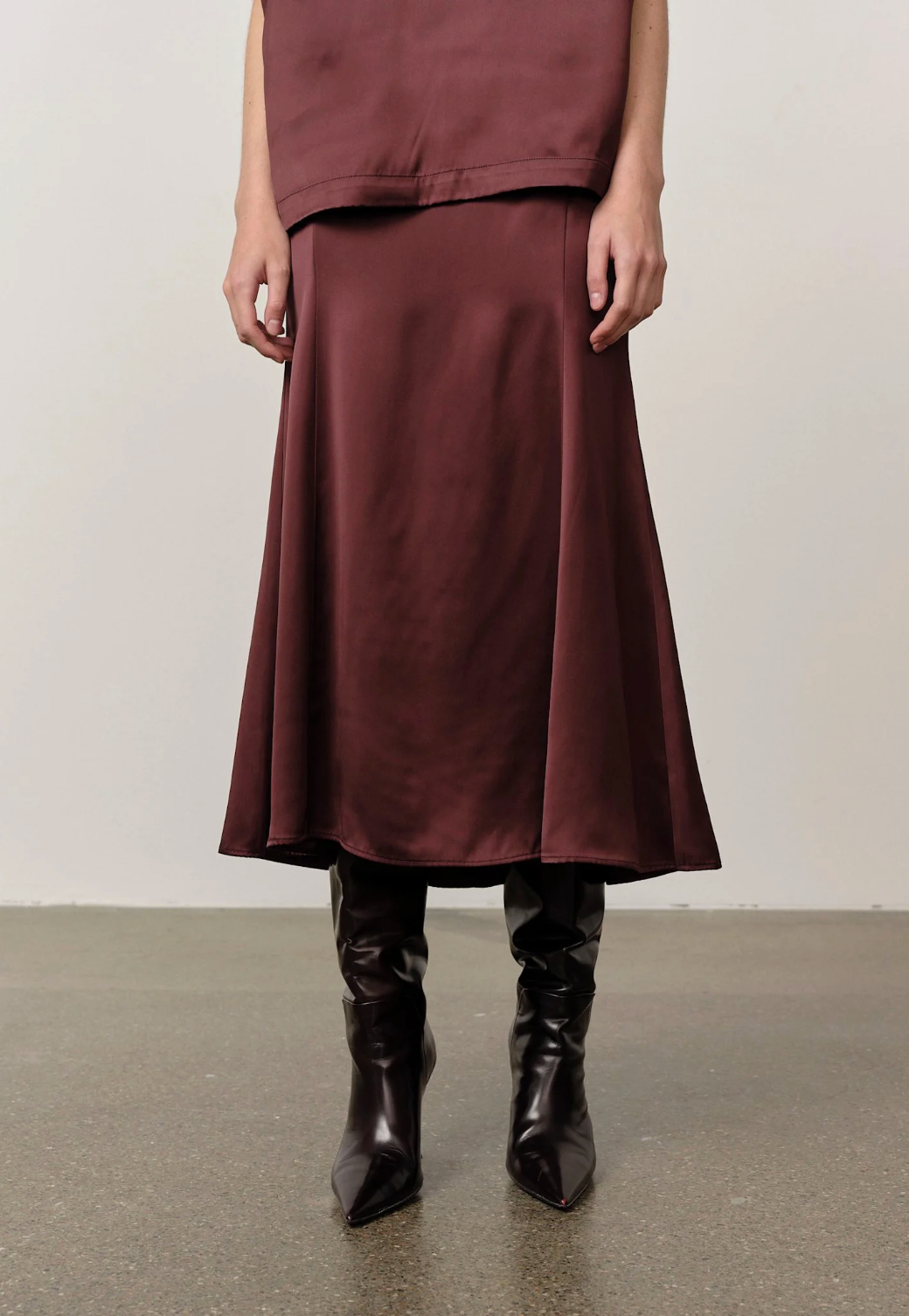 Voici la jupe Vamp : une jupe trapèze à taille moyenne avec de longues pinces, plus ample dans le bas.