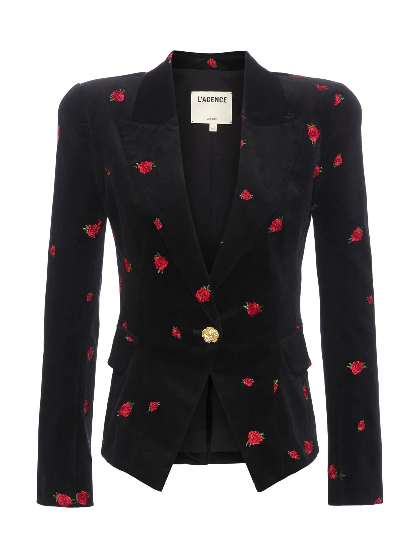 Le blazer Kaisley se réinvente dans une édition luxueuse en velours noir, brodé de délicates roses rouges pour un effet romantique et raffiné. Sa coupe ajustée souligne la silhouette tout en conservant une allure féminine et structurée. Le bouton doré à motif floral apporte une touche d’élégance, faisant de cette pièce un incontournable pour les soirées et les occasions spéciales.