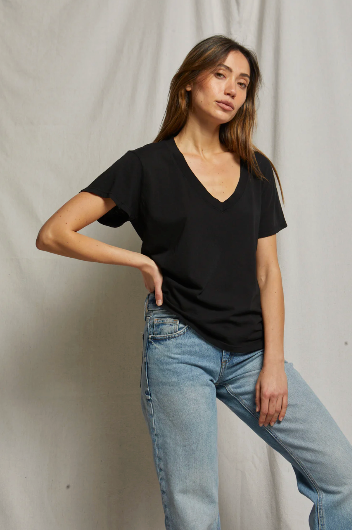 le t-shirt à col en V légèrement oversize parfait. tombe juste en dessous d'un jean taille mi-haute.