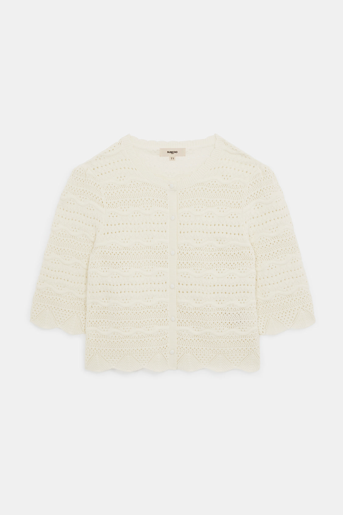 Un cardigan en maille ajourée au motif délicat, doté d’une coupe courte et féminine. Sa teinte blanc cassé apporte une touche douce et lumineuse, parfaite pour superposer avec élégance.
