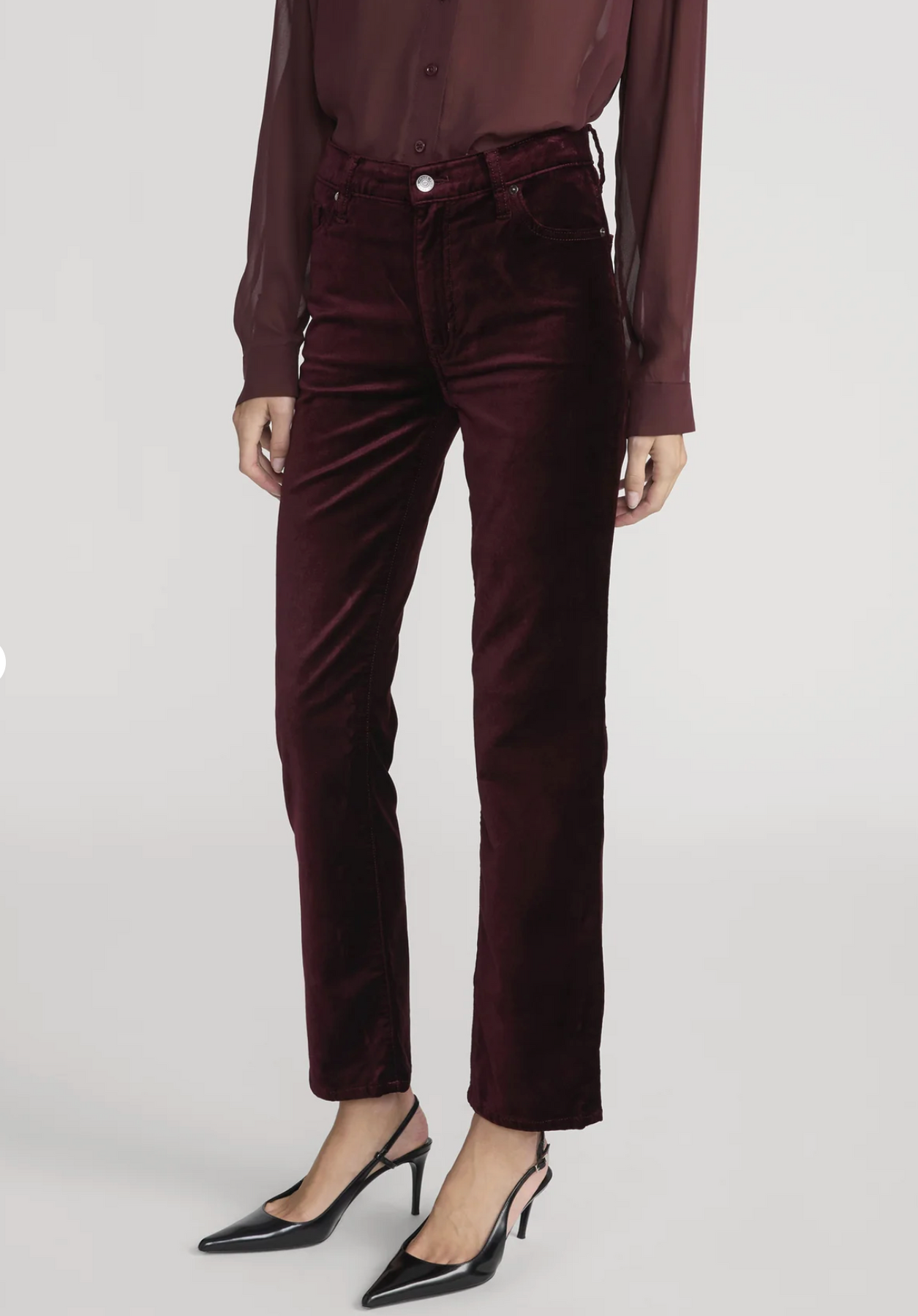 Notre silhouette classique Sleek Straight, réinventée dans un luxueux velours extensible à la riche teinte bordeaux. Ce pantalon est ajusté aux hanches et aux cuisses, et se prolonge en une jambe fine à longueur cheville.