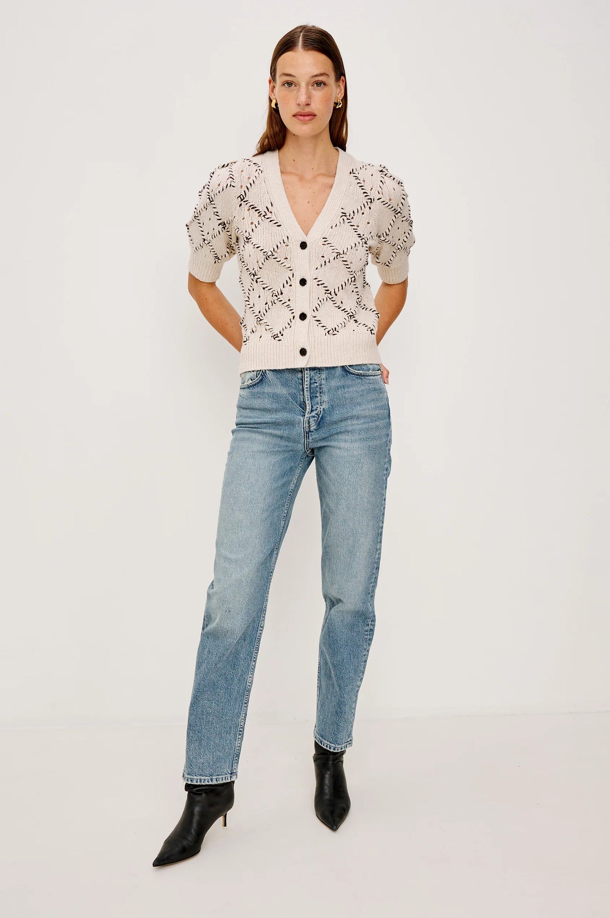 Un cardigan à manches courtes qui ne passe pas inaperçu. Confectionné en laine mélangée pour un confort douillet, le modèle Isla présente une texture losanges, des boutons en cuir tressé et une rayure pico ondulée. Féminin et raffiné, il rehaussera n'importe quelle tenue sans effort.