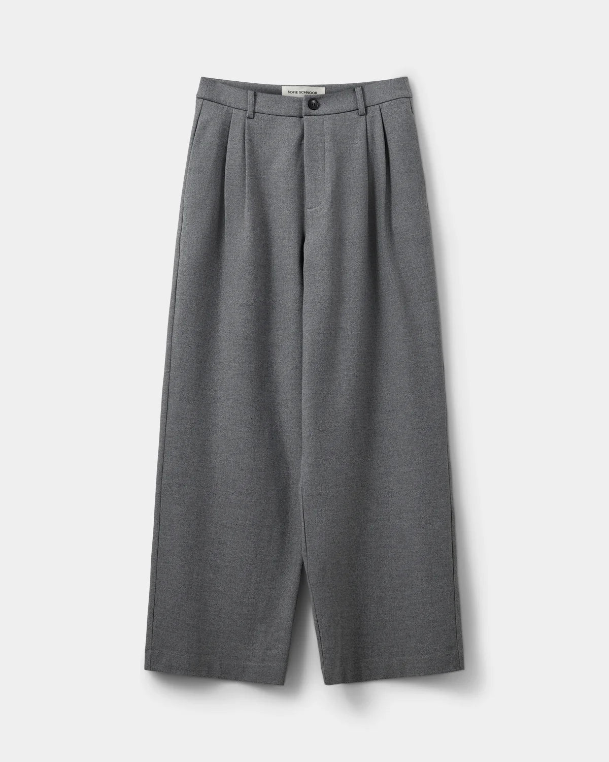 Ce pantalon gris chiné à coupe large combine élégance et confort. Sa taille haute et ses plis à l’avant structurent la silhouette, tandis que les poches latérales et les fausses poches passepoilées à l’arrière ajoutent une touche pratique et sophistiquée. Fermeture par zip et bouton, avec passants pour ceinture, pour un look soigné et polyvalent.