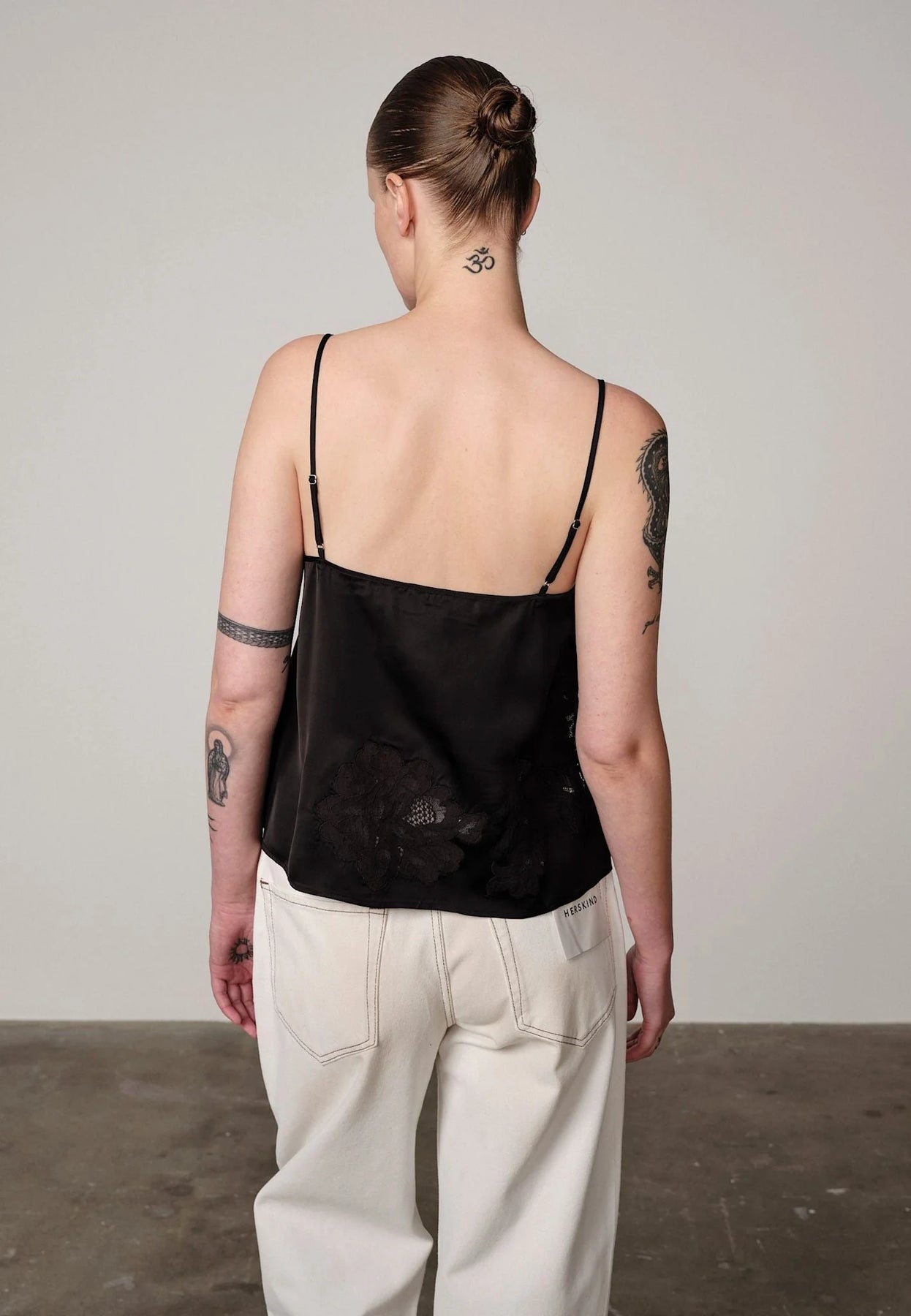 Un haut raffiné en viscose avec des empiècements de dentelle intégrés directement dans le tissu. Le contraste entre la viscose lisse et la délicatesse de la dentelle crée une expression moderne et texturée, à la fois féminine et architecturale.