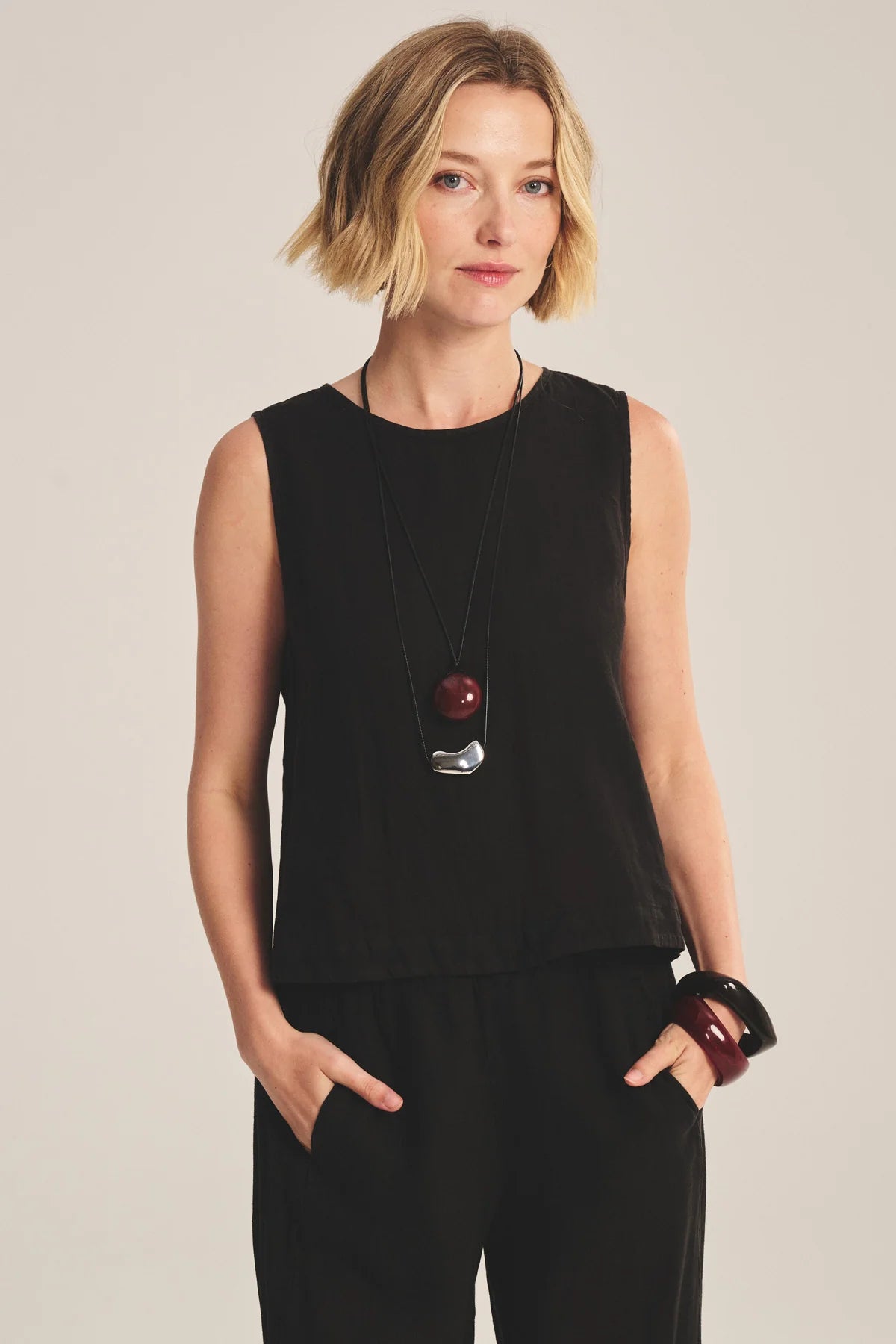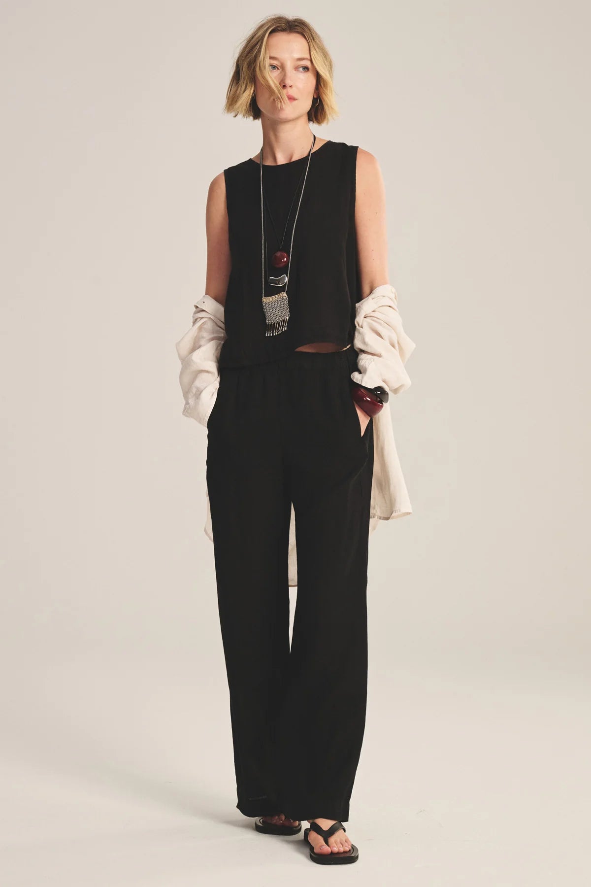 Confectionné dans un lin tissé léger, ce haut est conçu pour offrir une sensation de respirabilité idéale pour les journées chaudes. Avec sa silhouette sans manches, sa coupe ample et décontractée et son tombé fluide, il offre une liberté de mouvement et un confort sans effort. Doté d'une subtile fermeture en trou de serrure dans le dos, c'est un basique facile à porter pour un style raffiné au quotidien.