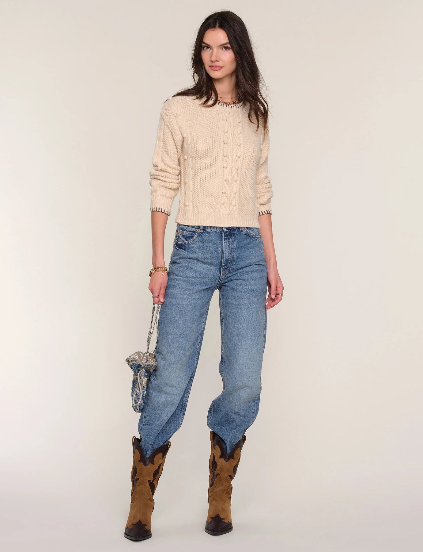 Pull en maille douce mélangée, à la coupe décontractée pour un confort optimal. Les détails torsadés (cable stitch) et les pompons ajoutent une touche texturée et féminine à cette pièce cosy et hivernale.