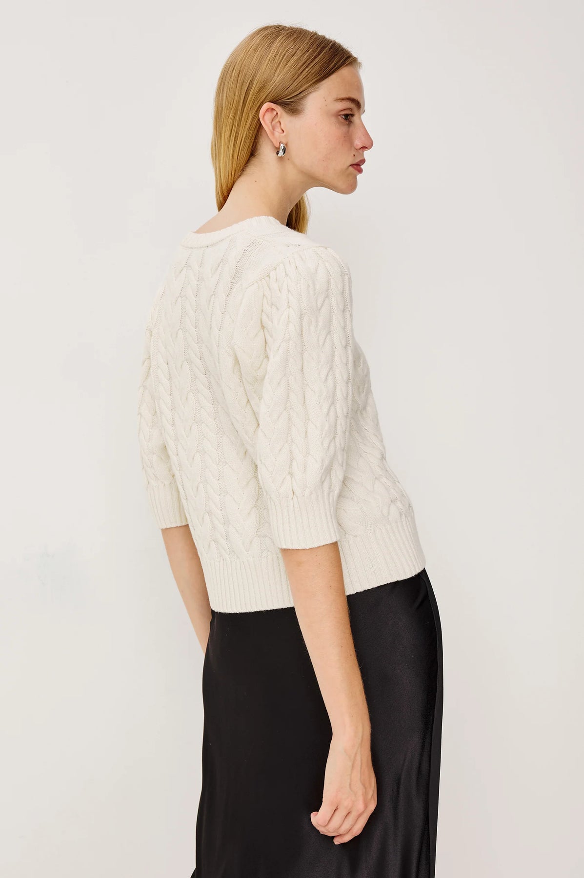 Intemporelle et romantique, la Clarissa célèbre l'élégance avec ses nœuds en velours contrastants. Confectionné dans une maille torsadée d'une douceur incomparable, ce pull court et décontracté présente des manches trois-quarts bouffantes et une fermeture à pression invisible sur le devant.