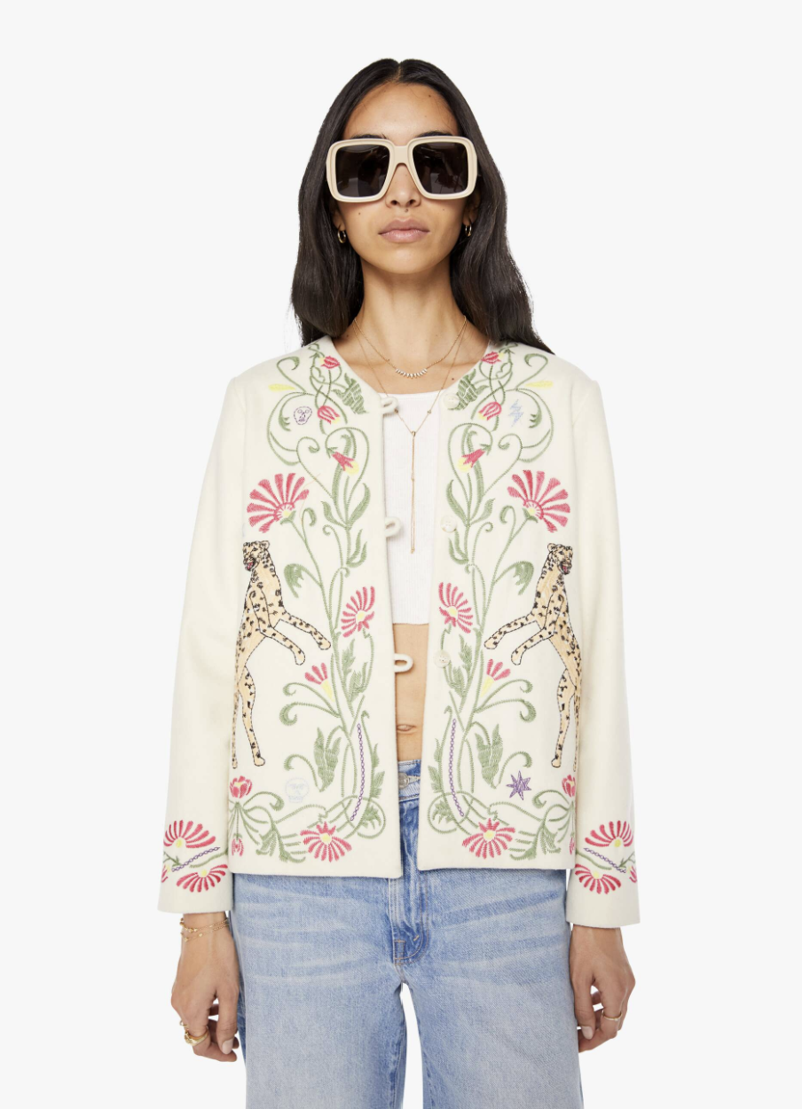 À l'affût. Une veste à col en V boutonnée sur le devant et à la coupe ample et carrée. Confectionnée en laine mélangée, Alley Cat Antics est d'un blanc cassé crème orné de détails floraux, de guépards et de vignes.