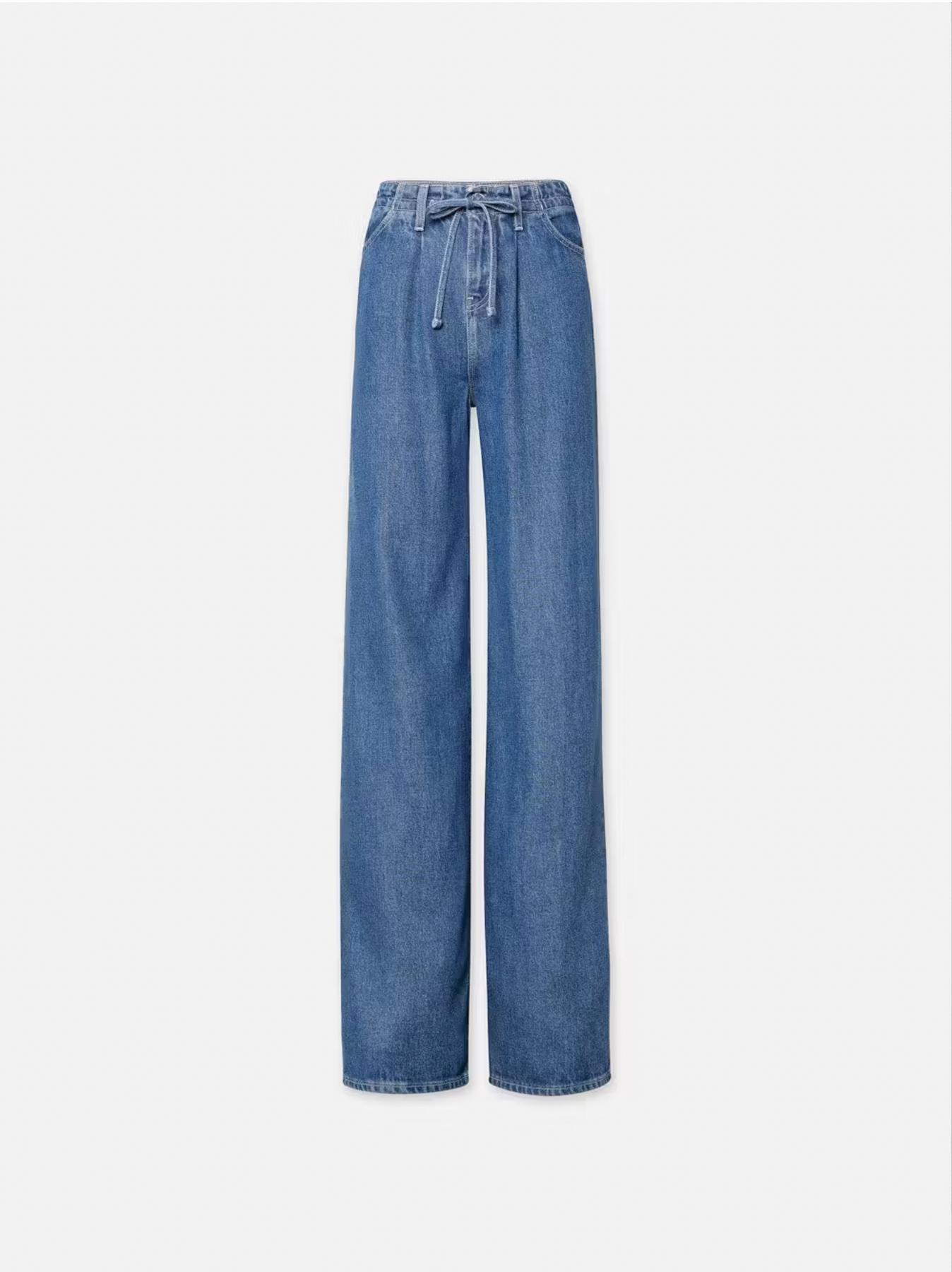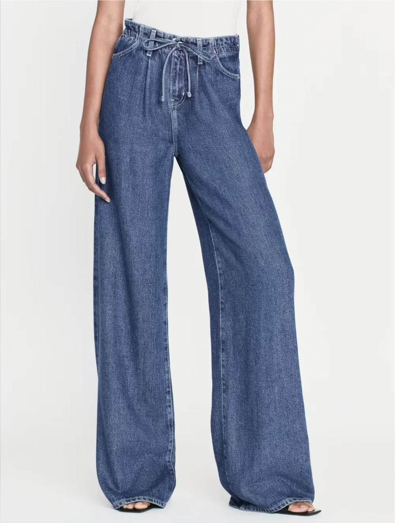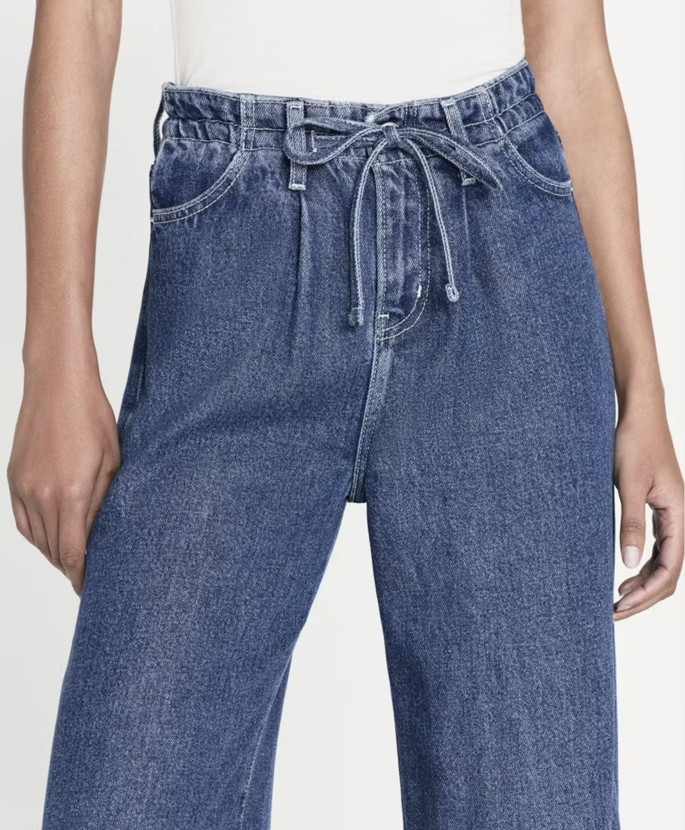 This lightweight wide-leg jean features a drawstring waistband and subtle darts for a cinched waist. Made from medium-wash denim with contrasting stitching, it drapes beautifully for a flattering fit.