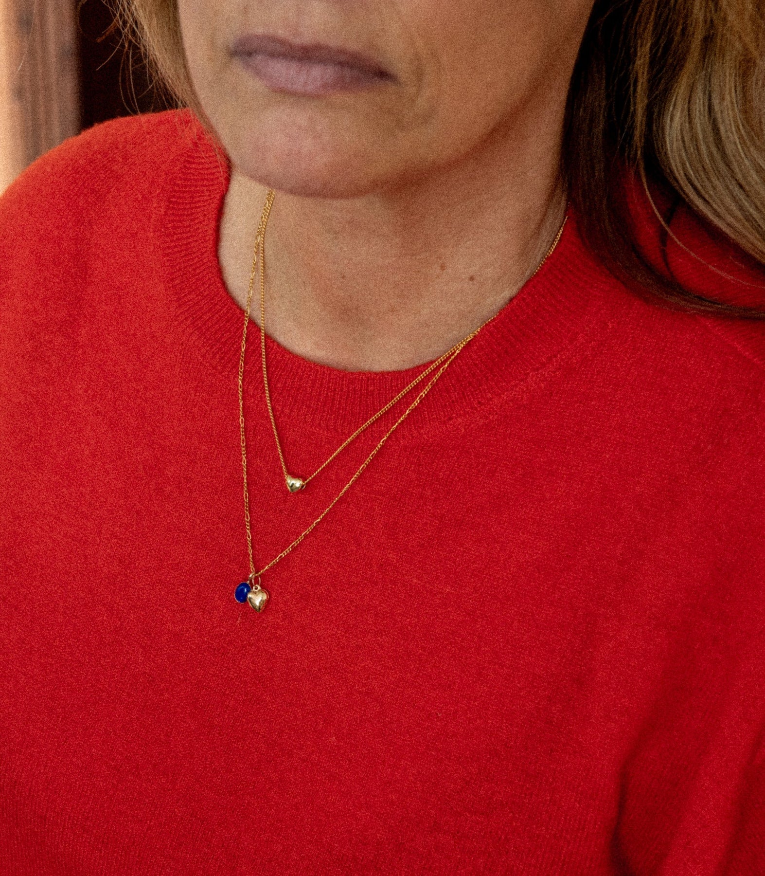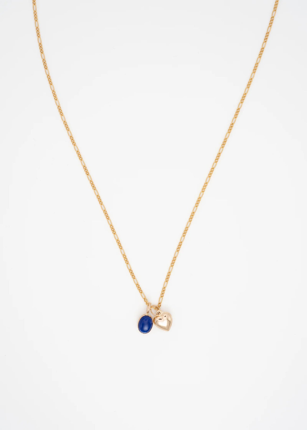 Collier 18" chaîne figaro en or rempli avec deux breloques, dont un coeur en or rempli et le choix d'une pierre ovale sertie en or rempli. Avec rallonge de 2.5".