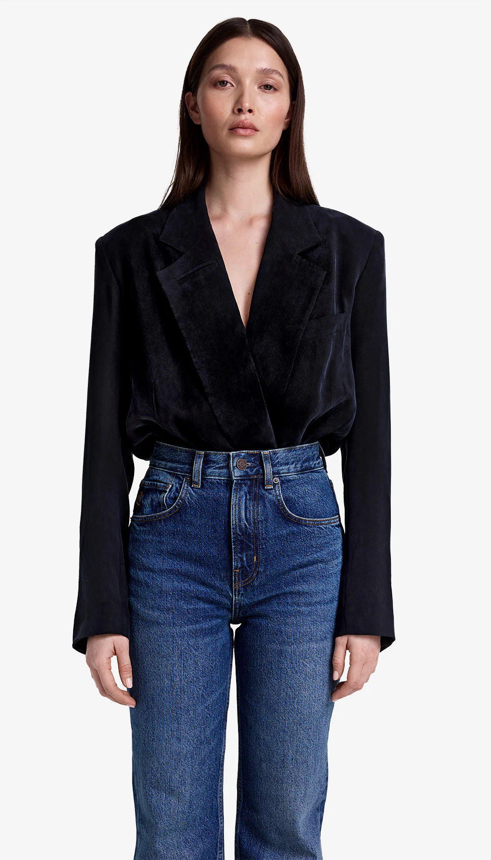 Notes de style : Un blazer rentré est l’un de nos looks préférés. Ce body offre le même effet, sans l’encombrement. Le tissu cupro drapé est intemporel et convient à tous les climats.