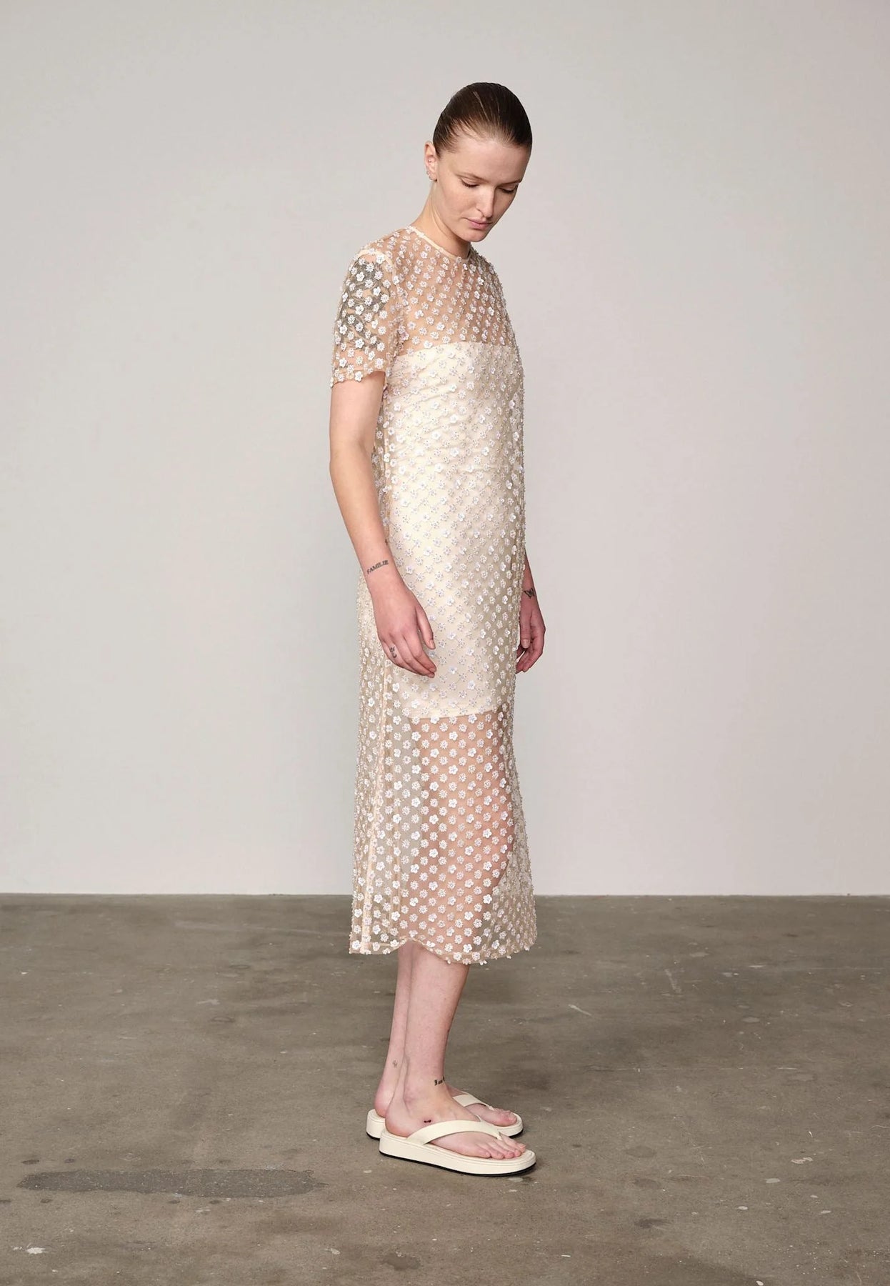 Une robe en maille brodée transparente qui équilibre structure et sensualité. Conçue avec une silhouette ajustée et doublée d’une sous-robe tube en jersey ton sur ton pour une couvrance douce et une transparence subtile. Une pièce élégante et moderne qui se porte facilement du jour au soir.