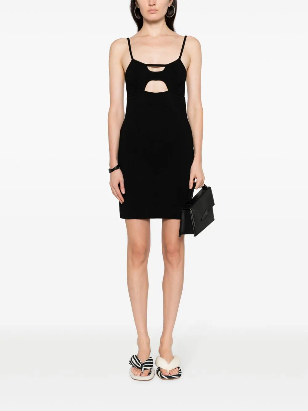 The Seca mini dress, designed to captivate with its unique cutouts and open back. It arrives in a sleek black shade and falls to the thigh-length silhouette.