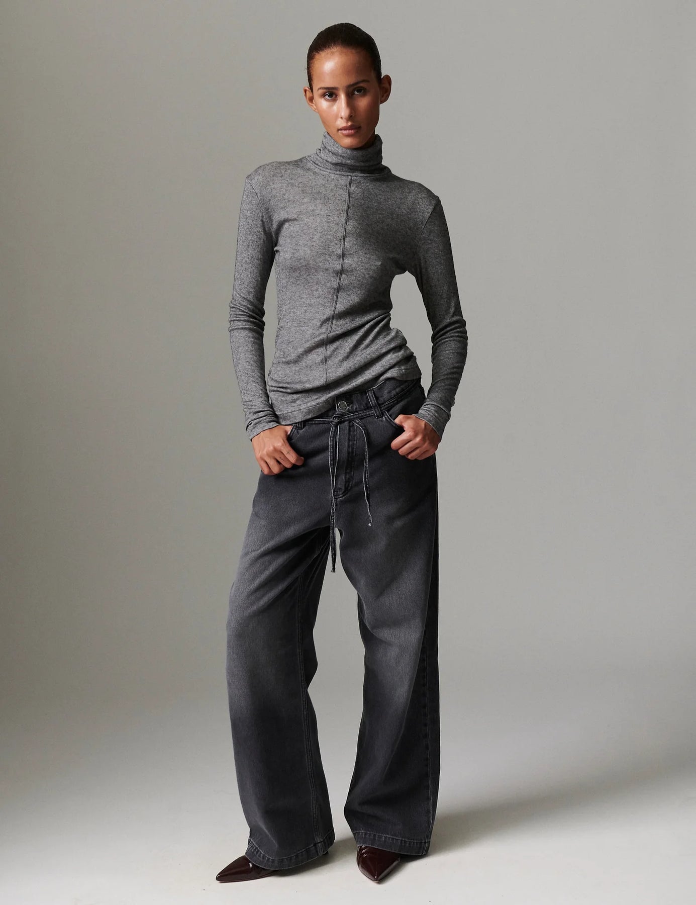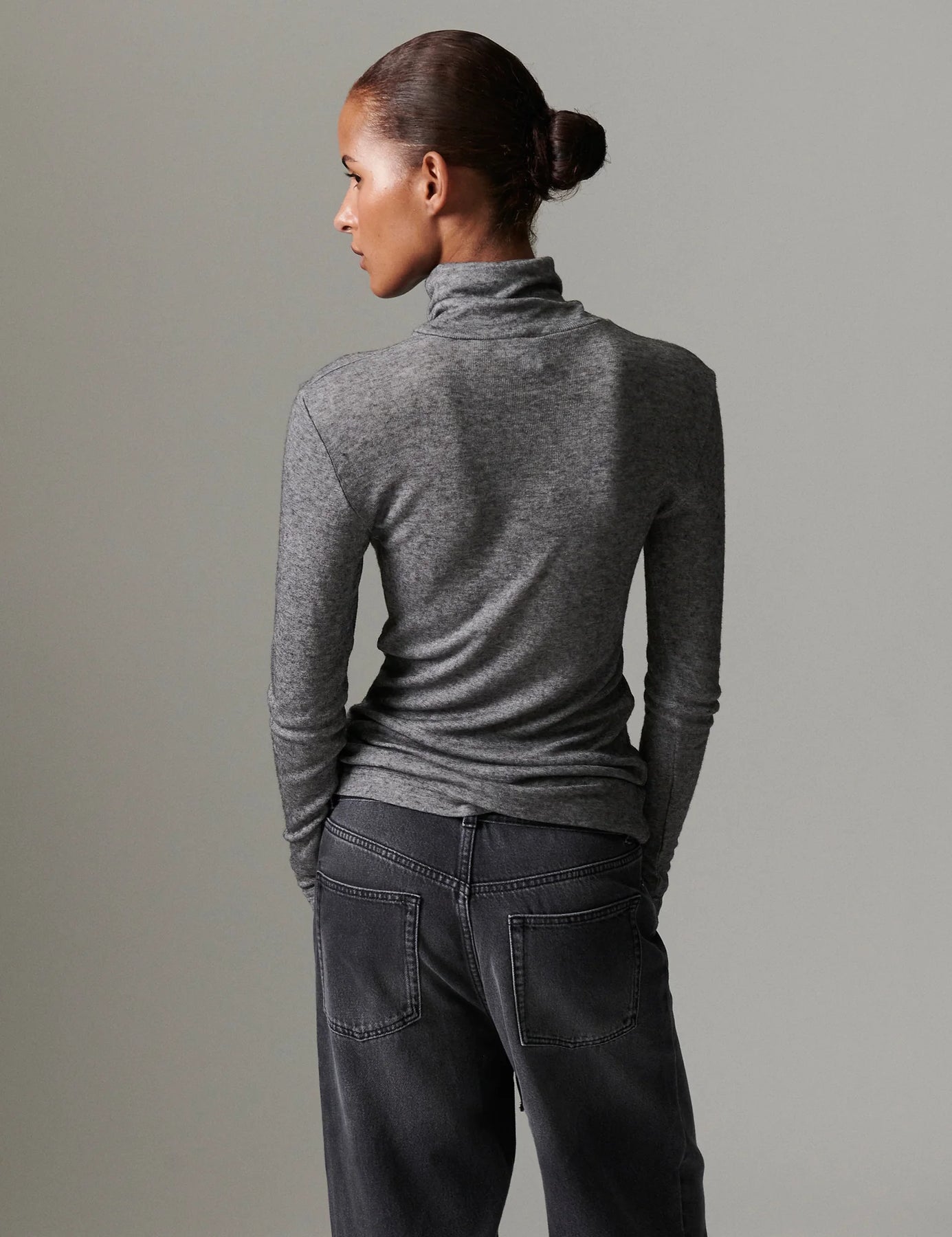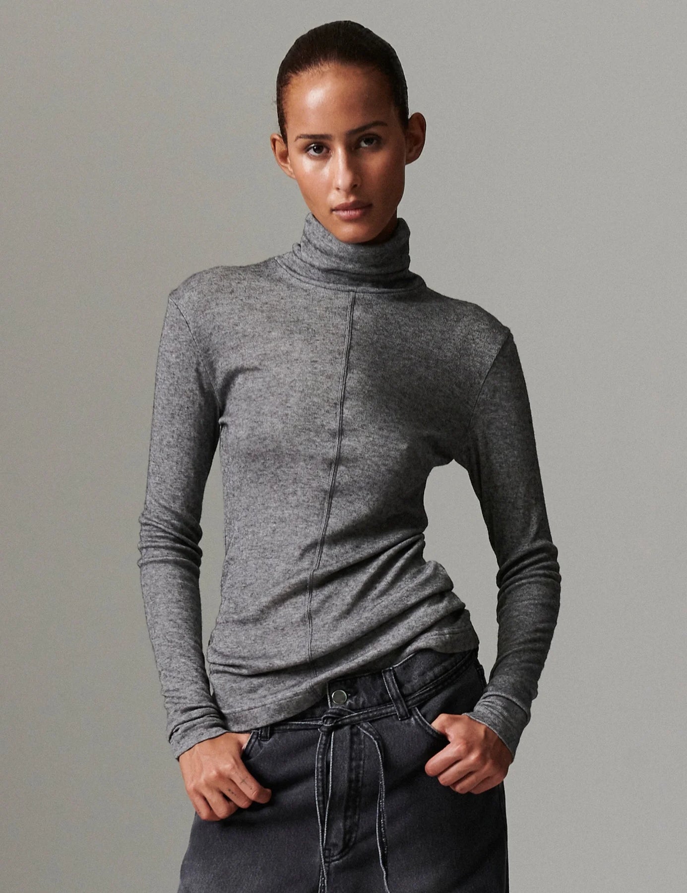 Ce haut à col roulé doux et fin présente une couture centrale surélevée. Il est ajusté et extensible.