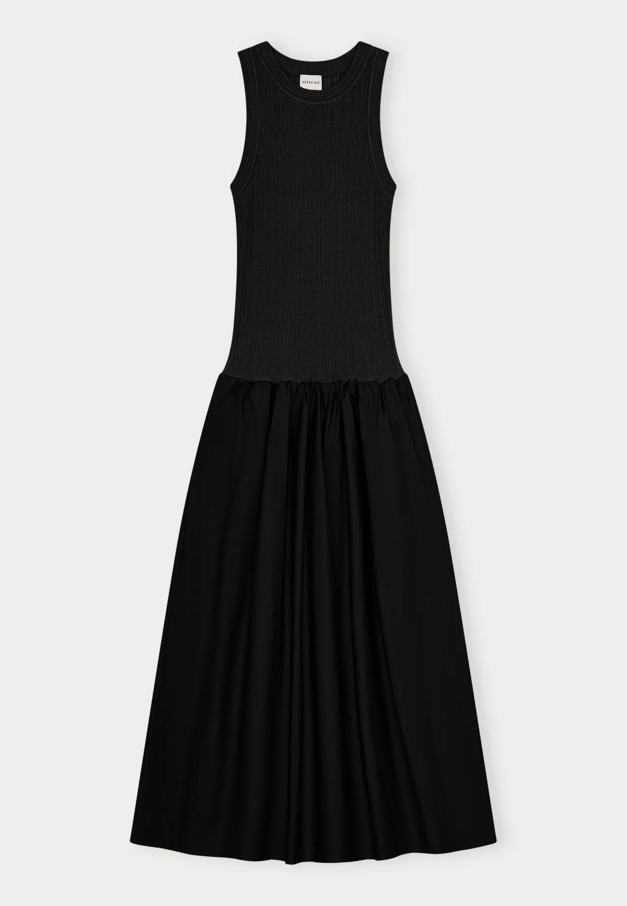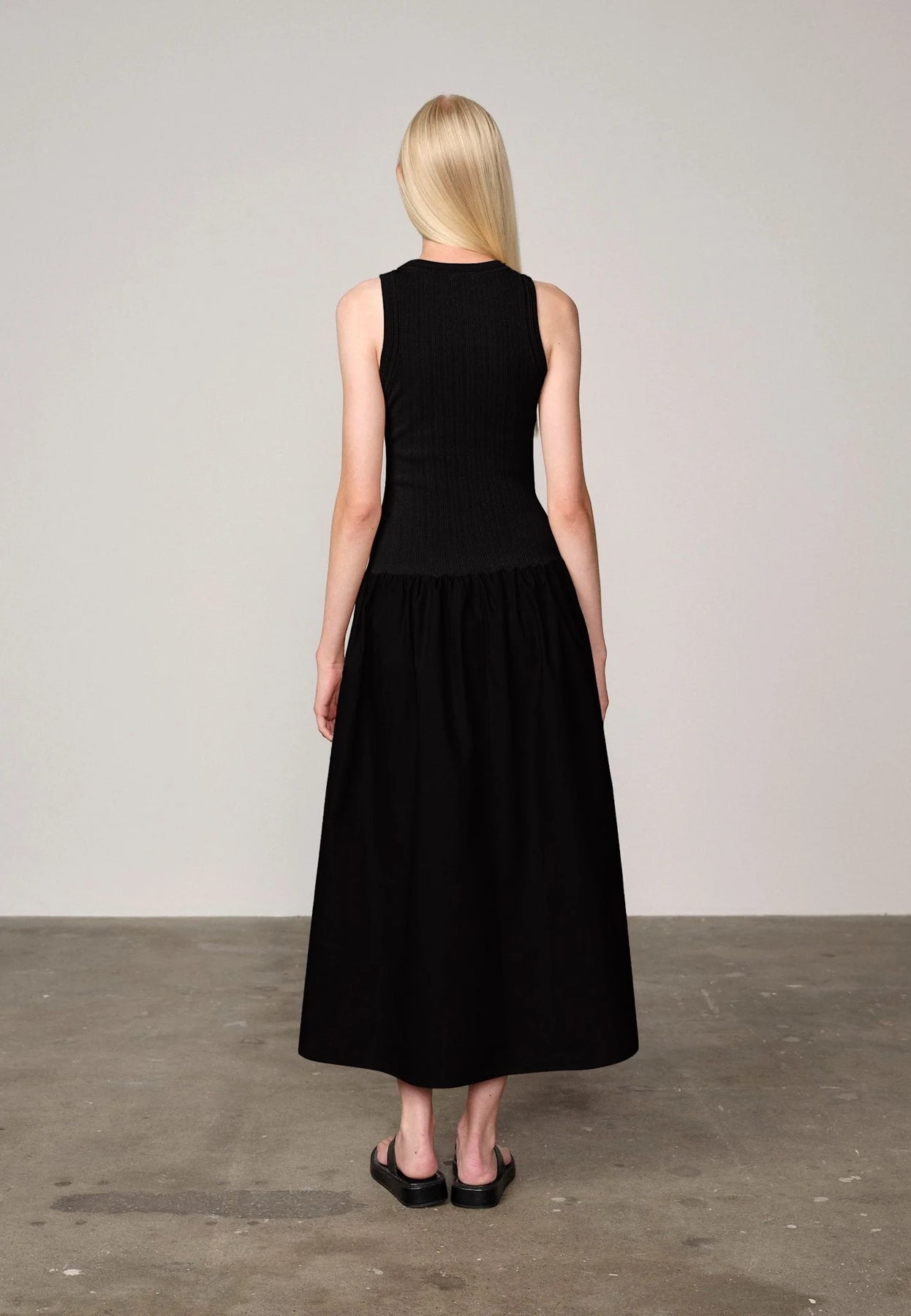 Une robe hybride combinant un haut en maille côtelée et une jupe en popeline de coton structurée. Le contraste entre la maille douce et ajustée et le coton net crée une silhouette à la fois raffinée et naturelle — moderne, féminine et polyvalente.
