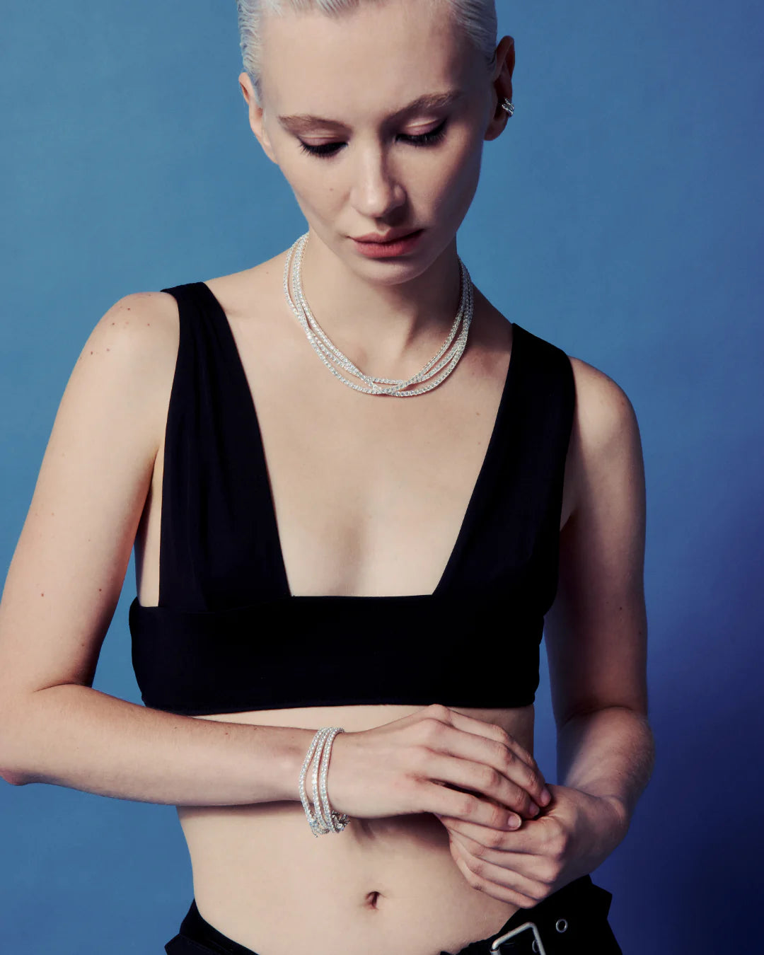 Collier tennis argenté orné d’une rangée continue de cristaux. Longueur : 16 po.