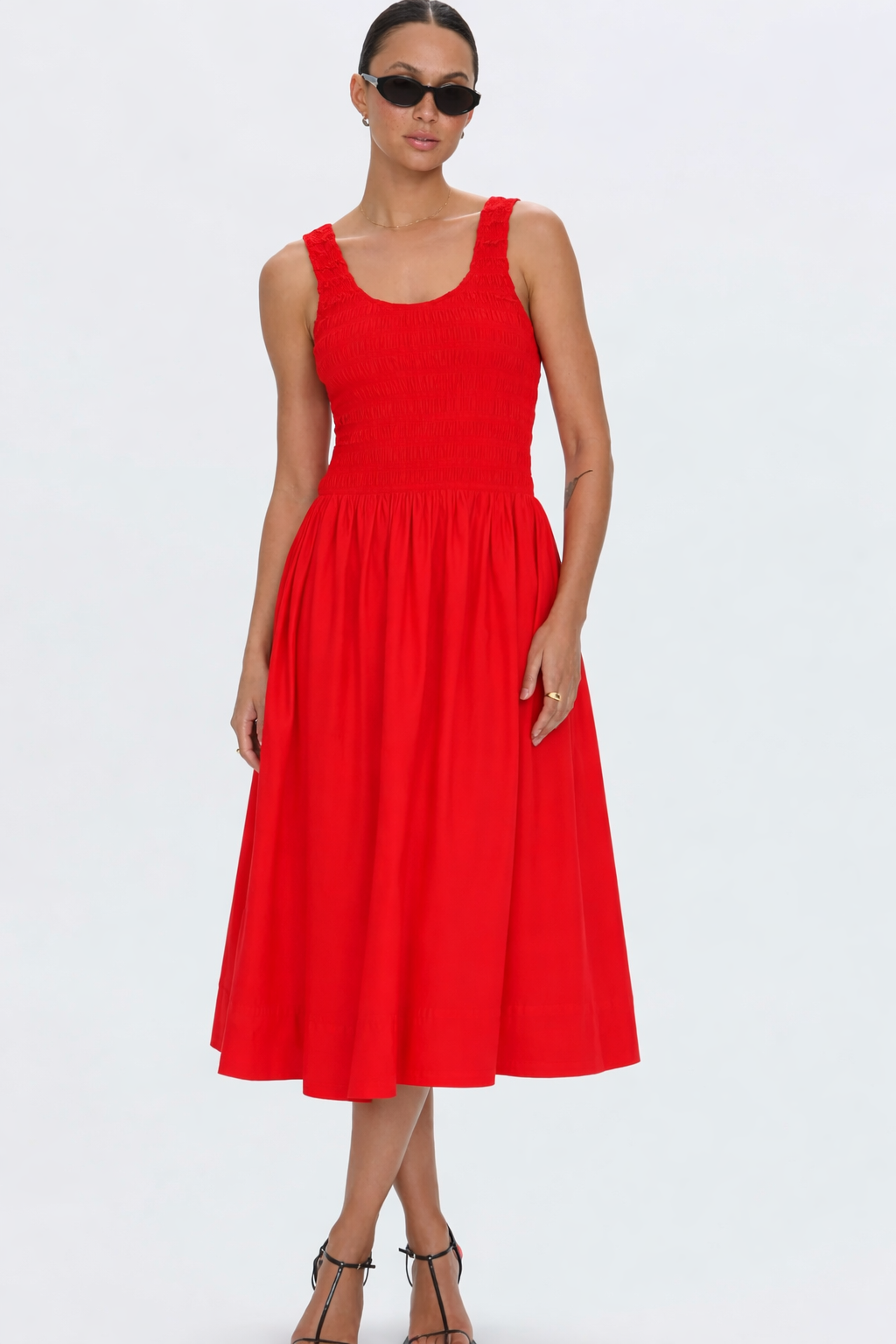 Robe de jour texturée confectionnée dans une matière légère, pensée pour les journées chaudes. Elle présente un corsage smocké de style débardeur qui se prolonge par une taille froncée et une jupe midi ample aux proportions équilibrées.