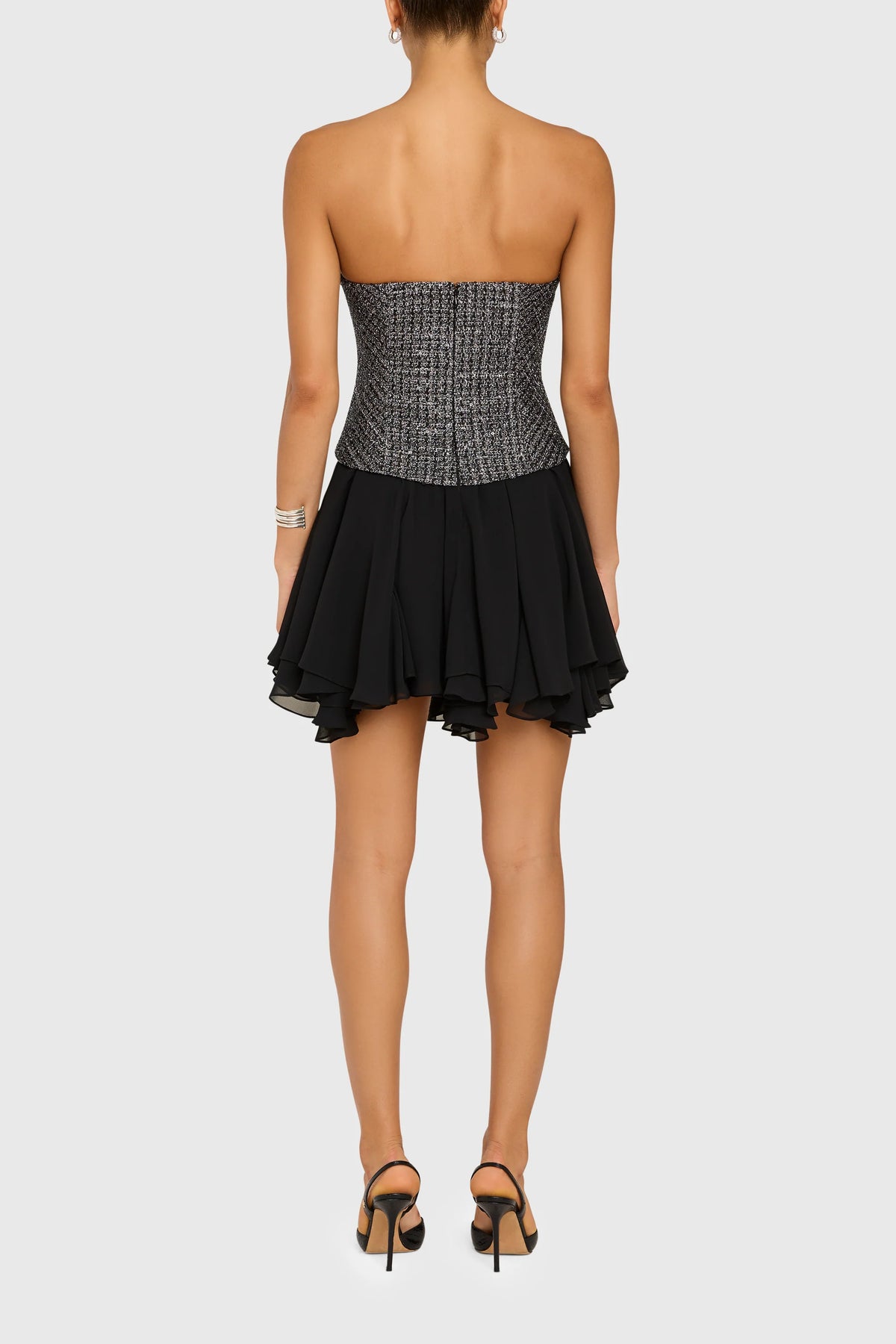 La robe Airess allie structure et fluidité grâce à son corsage bustier façon corset en tweed métallisé et sa jupe en chiffon vaporeuse. Portez-la avec des sandales à brides pour une finition élégante et raffinée.