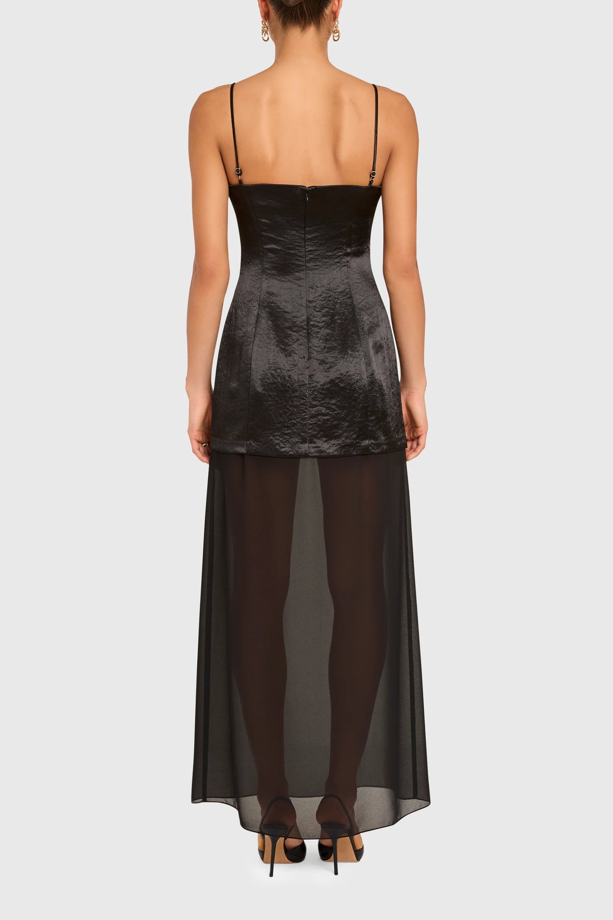 Élégante et moderne, cette robe maxi présente une superposition inférieure transparente qui apporte une touche audacieuse à votre garde-robe hivernale.