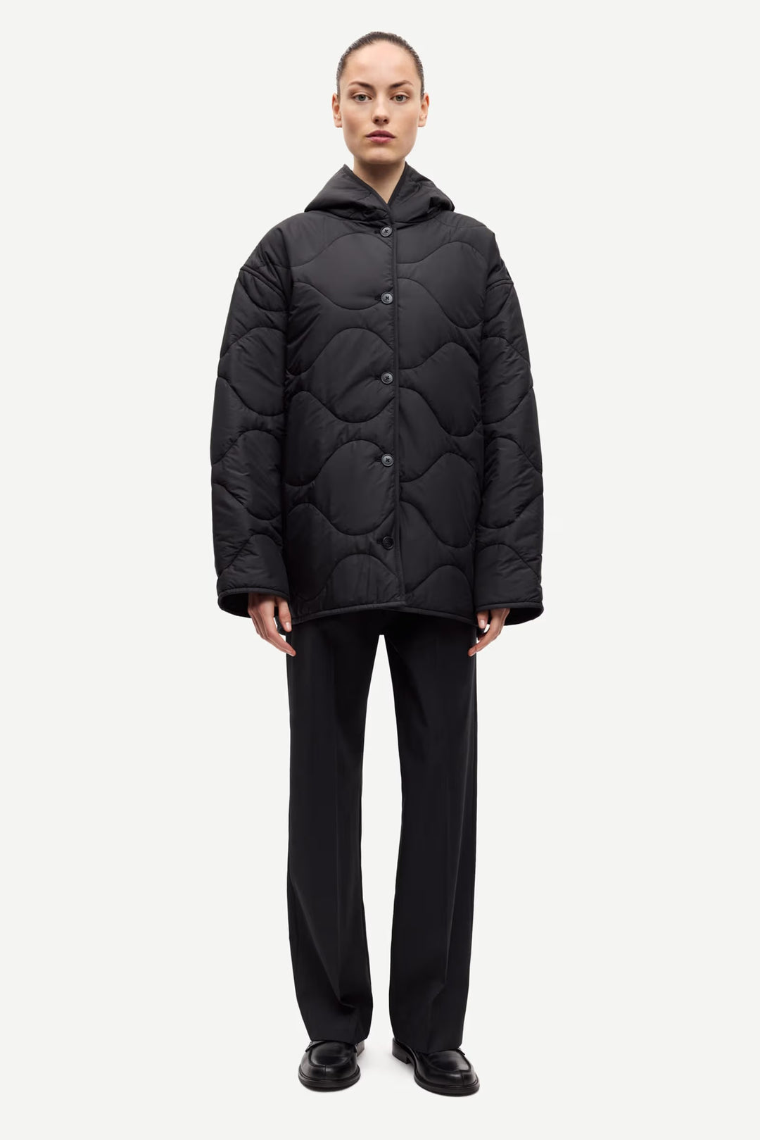 Oversized quilted jacket with a stand-up collar. Two-way zipper and snap buttons at the front. Removable hood with snap buttons. Drawstring at the hem. Buttoned flap pockets on the front and an inner flap pocket. Samsøe Samsøe logo printed on the back. Padded with THERMORE® Ecodown. Fully lined. The main material is made from a recycled polyamide blend. This product is GRS certified. Every step of the supply chain has met strict social, environmental, and chemical requirements.