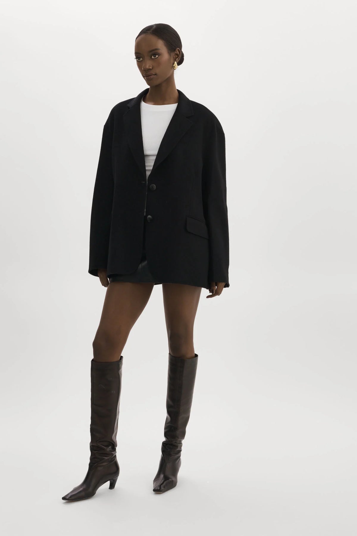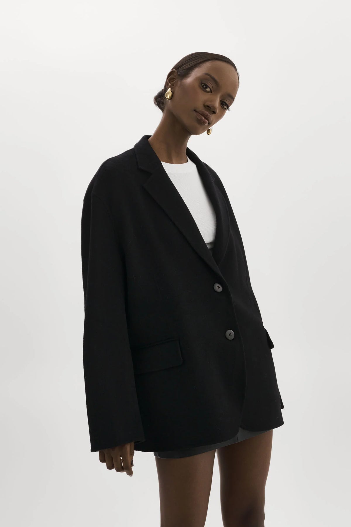 Offrez-vous le summum du chic avec le blazer oversized Ennis en laine. Cette pièce intemporelle à boutonnage simple présente un col à revers et des poches à rabat sur les côtés, alliant sophistication et style contemporain. Associez-le à des pantalons classiques pour un look élégant et sans effort.