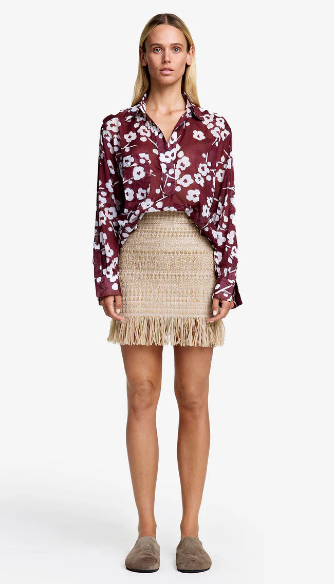 Cette jupe façon raphia est idéale pour la plage. On l'adore avec la chemise Over The Head couleur Sangria.